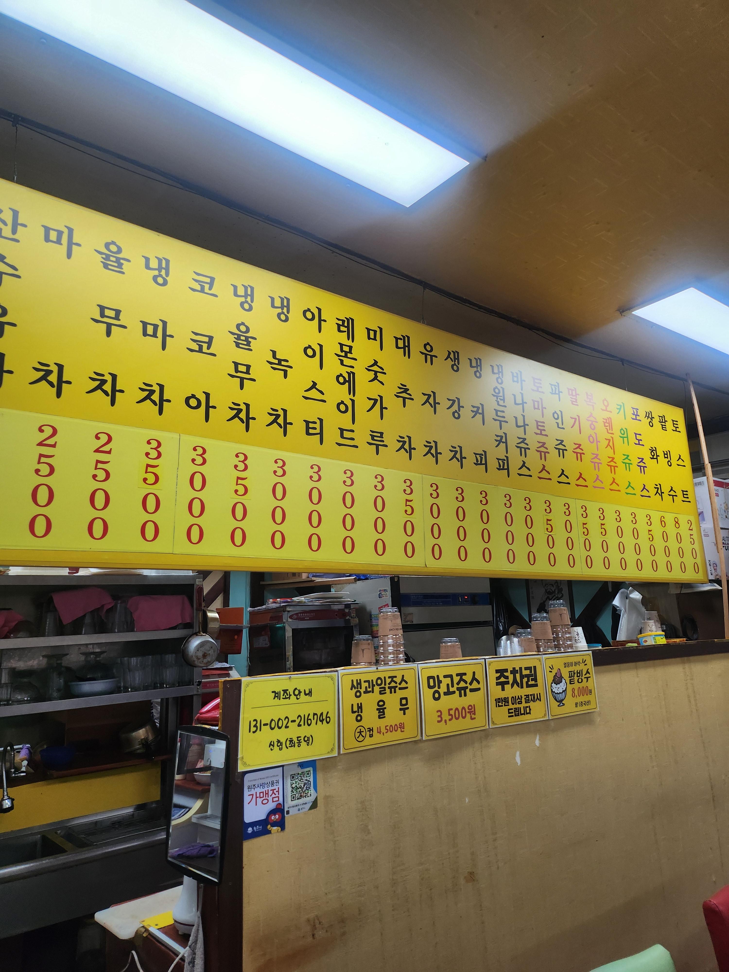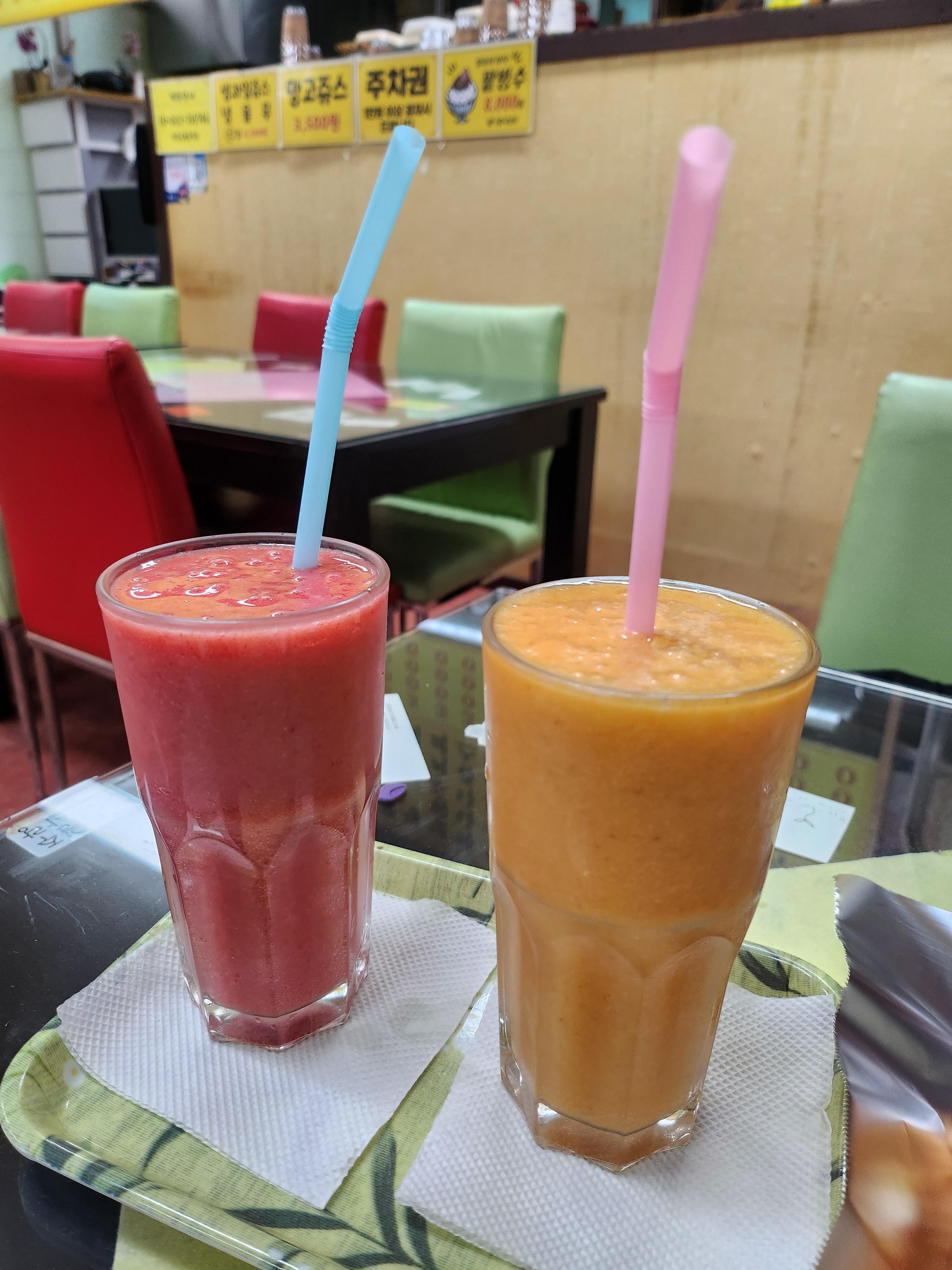 요즘 카페들 음료수 가격이 비싼데 여전히 싼 가격을 유지해쥬셔서 원주 사시는 분들 복 받았다는 생각이 들어요. 이곳은 주인아저씨가 자부심을 가질 정도의 질 좋은 생과일을 재료로 쓰셔서 생과일주스가 일품이에요.
