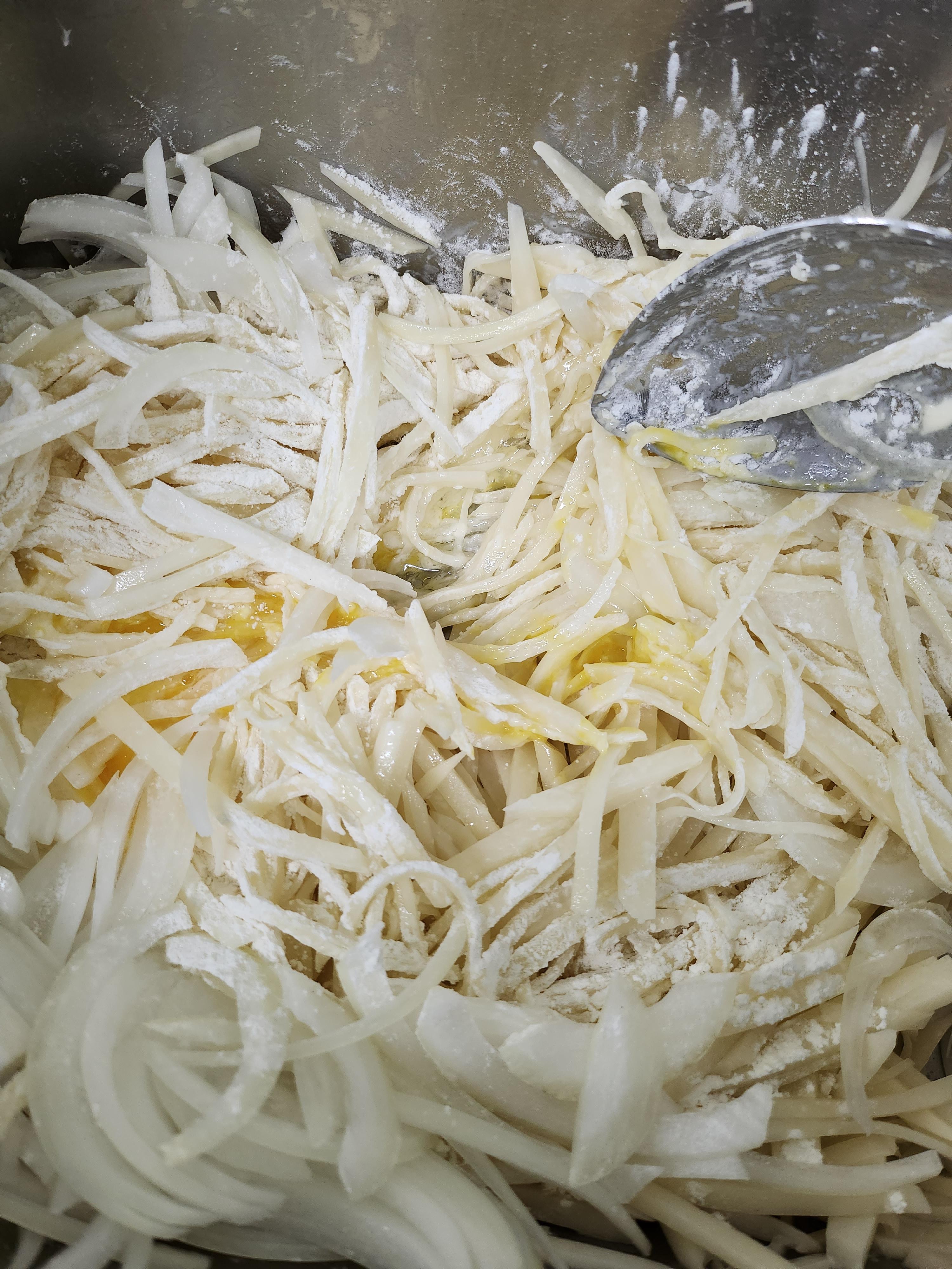 양파채도 감자에 같이 넣어서 전을 부치면 향긋한 양파맛이 전의 풍미를 한층 살린다.