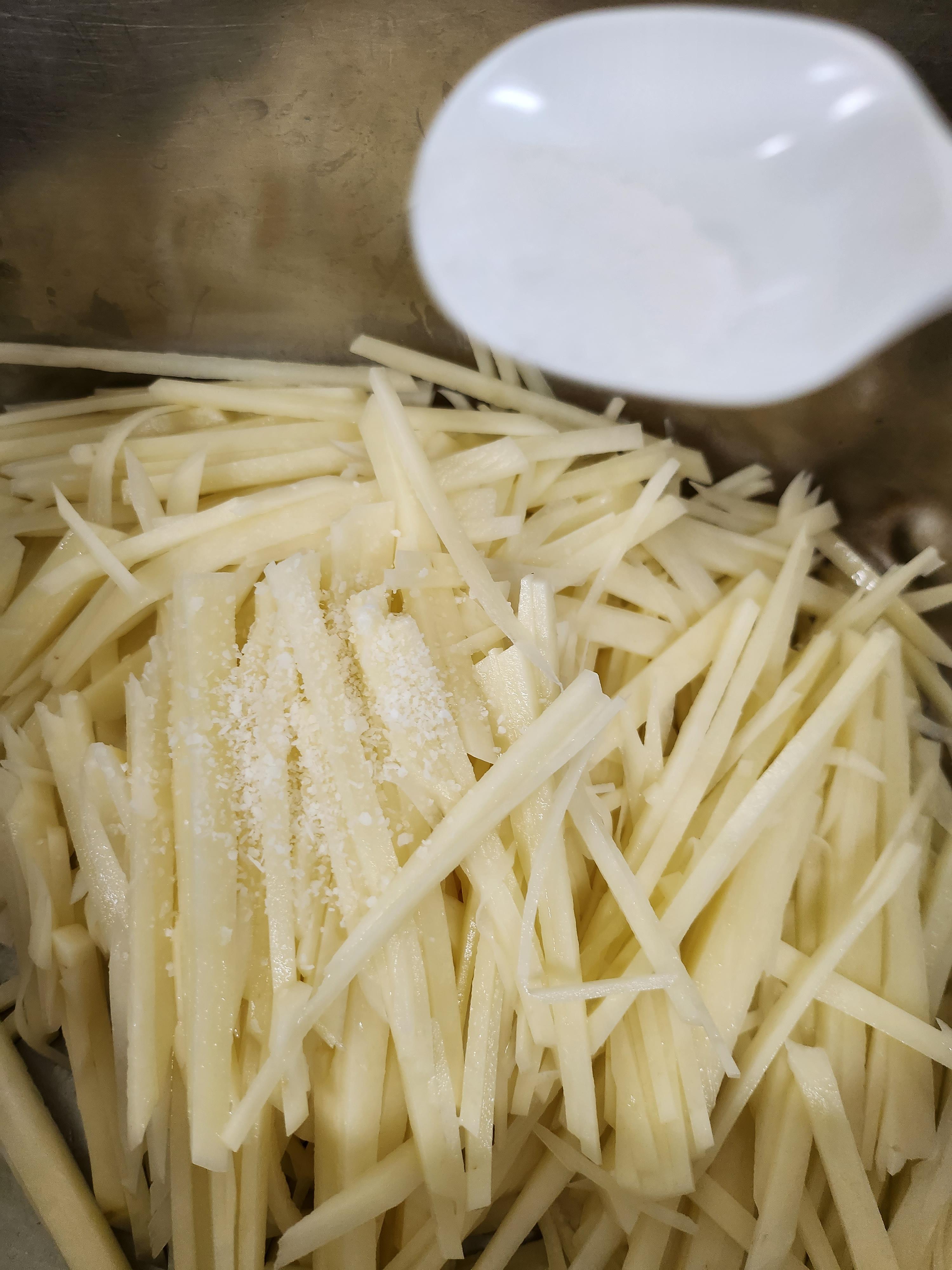 세 개의 감자채를 그릇에 담고 1 티스푼정도의 소금을 뿌려서 골고루 섞어준다. 빠른 변색도 막아주고 밑간도 된다.
