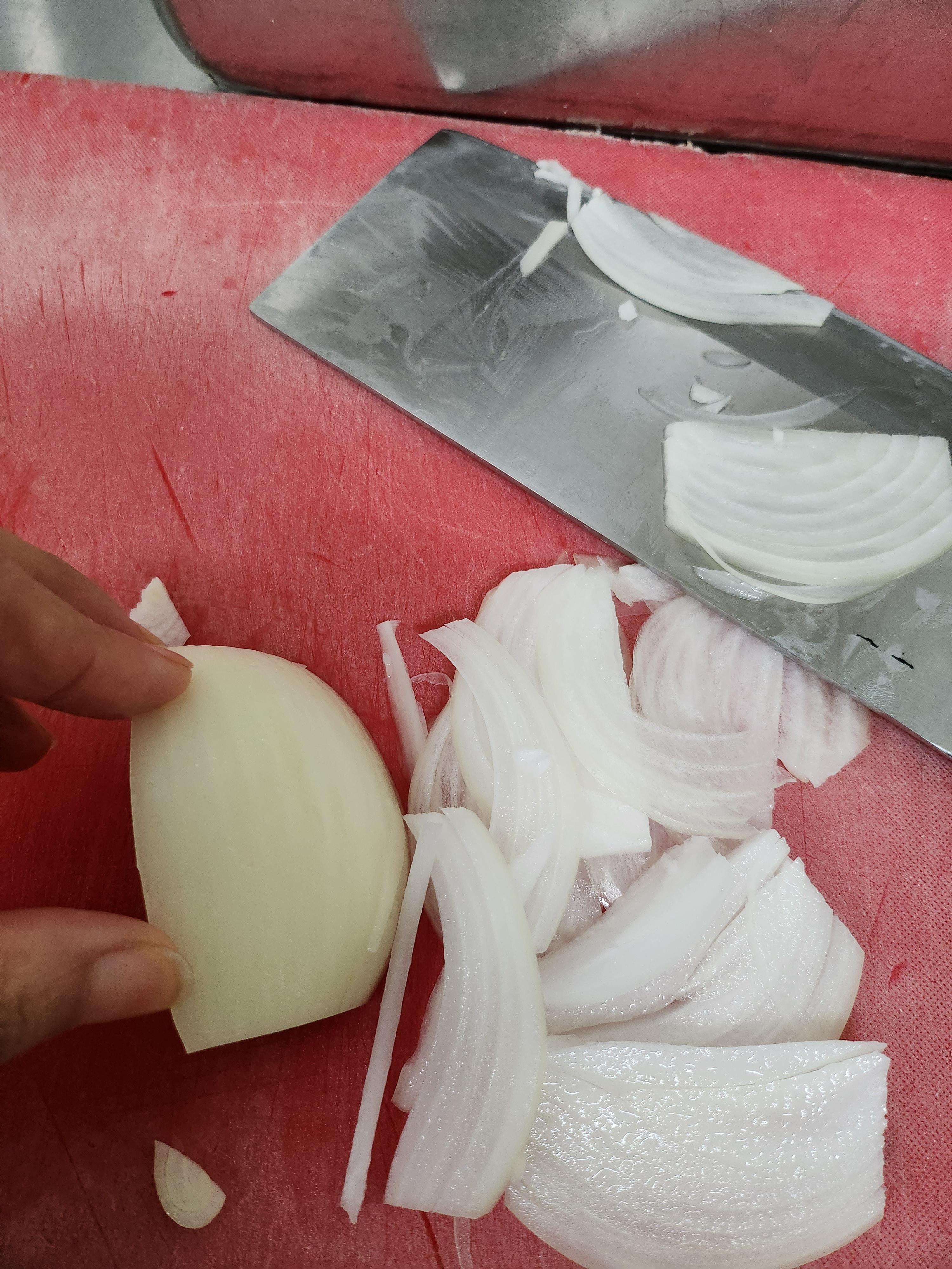 이것도 작은 팁인데 양끝을 잘라내면 양파채를 썰을 때 붙지 않고 깔끔하게 채를 썰 수 있다.