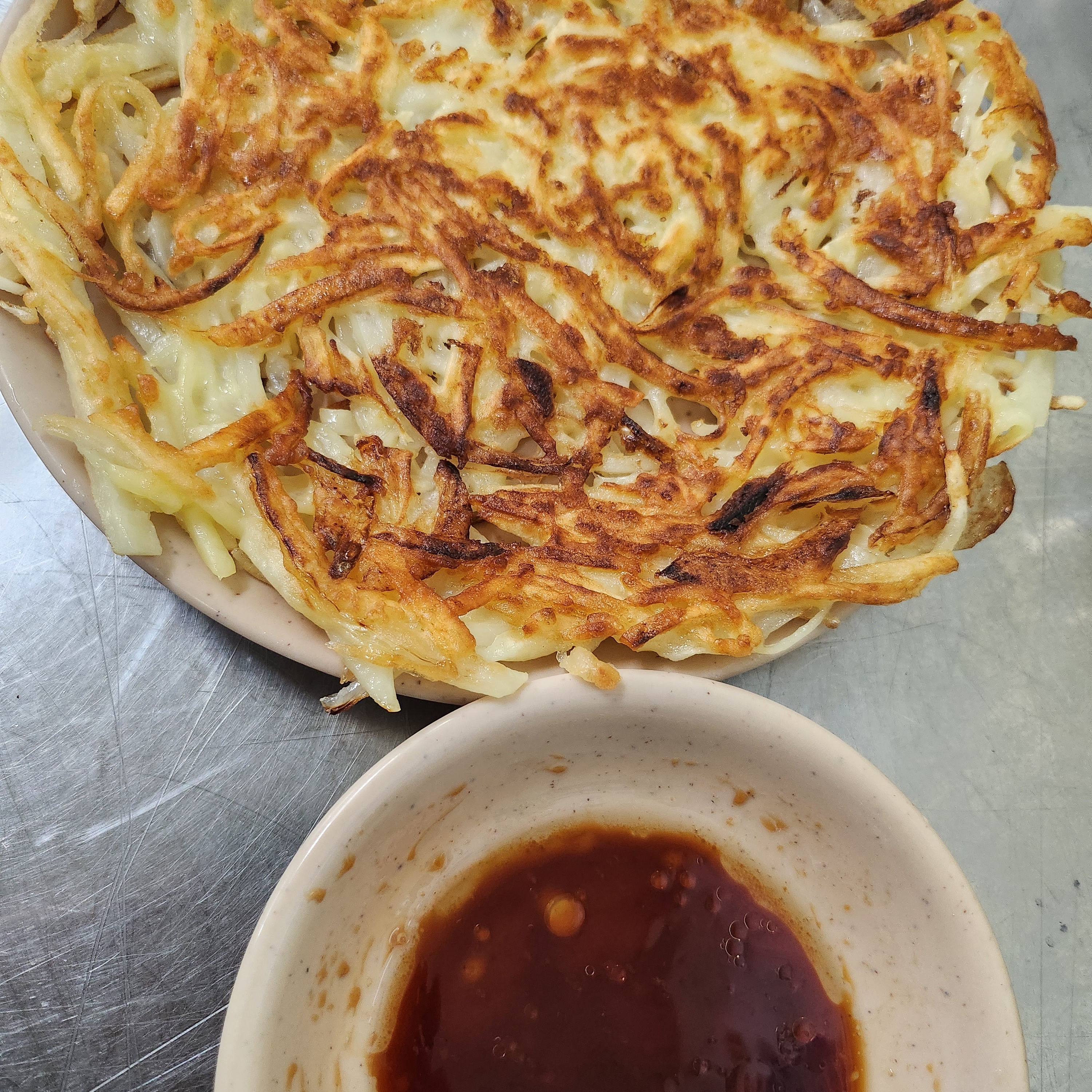 취향에 맞게 간장물(간장, 깨소금, 참기름, 물)을 만들어 바삭하게 구워진 감자채 전을 맛있게 먹는다.