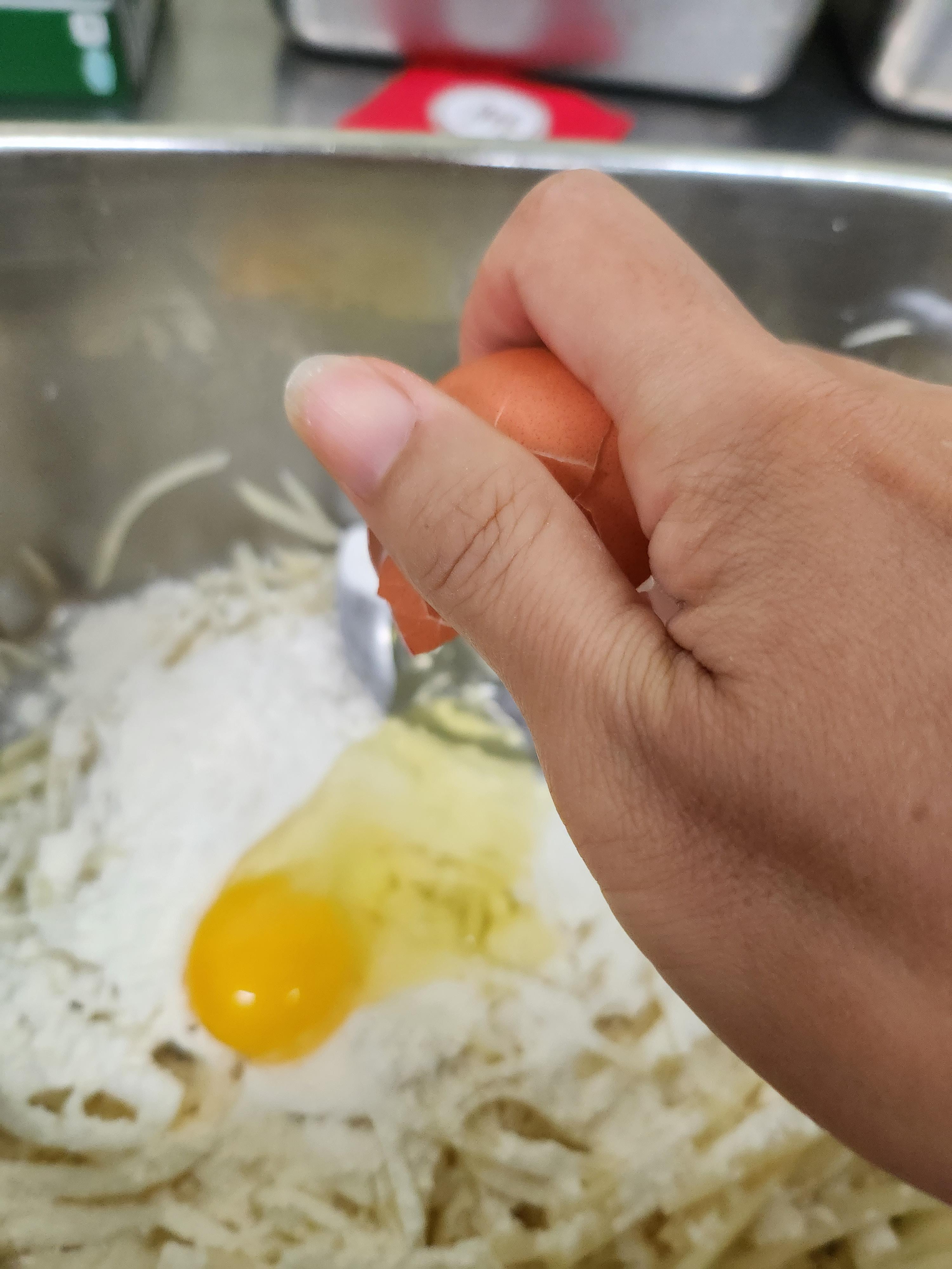 계란 한 개 를 깨서 넣고 잘 저어 반죽한다.