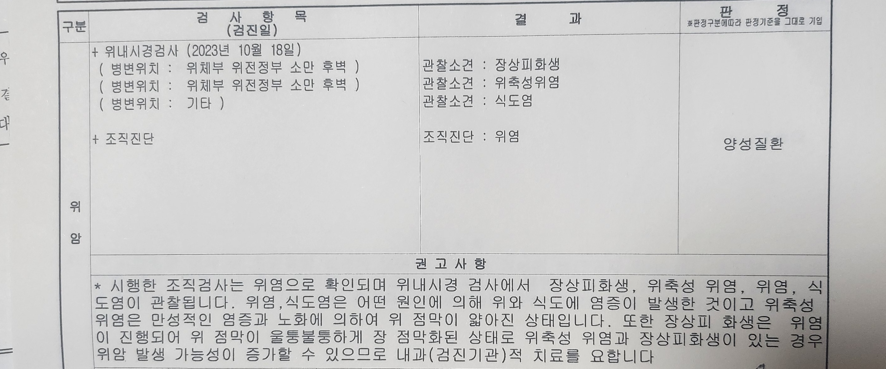 올해 건강검진에서 위 내시경 검사를 받았다. 역류성 식도염, 역류성 담즘액, 위축성 위염을 진단 받았다.