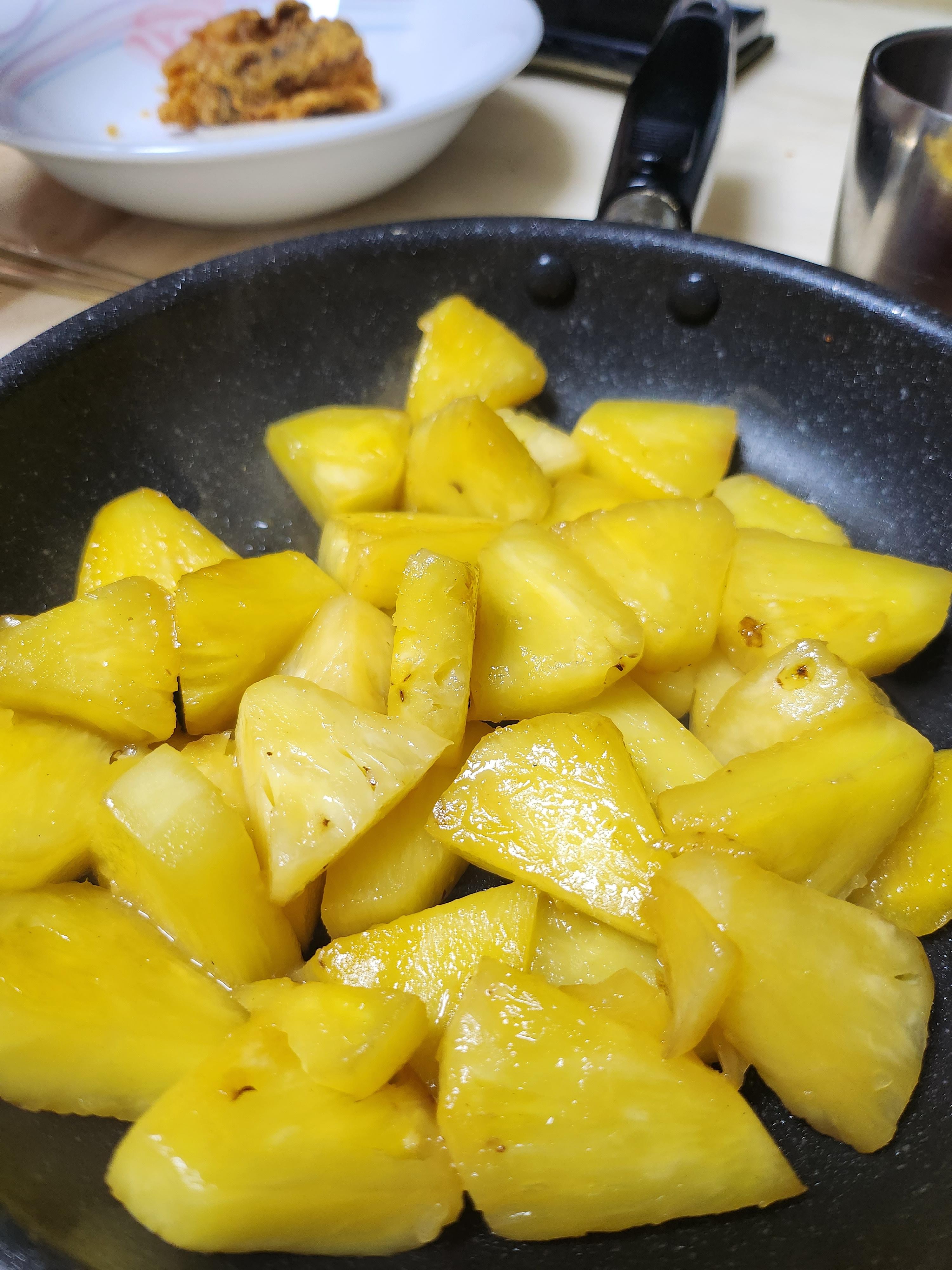 파인애플을 프라이팬에 넣고 기름을 살짝 두르고 열이 많이 올랐을 때 볶다가 소주를 뿌리듯이 겉들이고 볶으면 신맛이 감소하면서 단맛이 증가되고 소화에 도움이 된다.