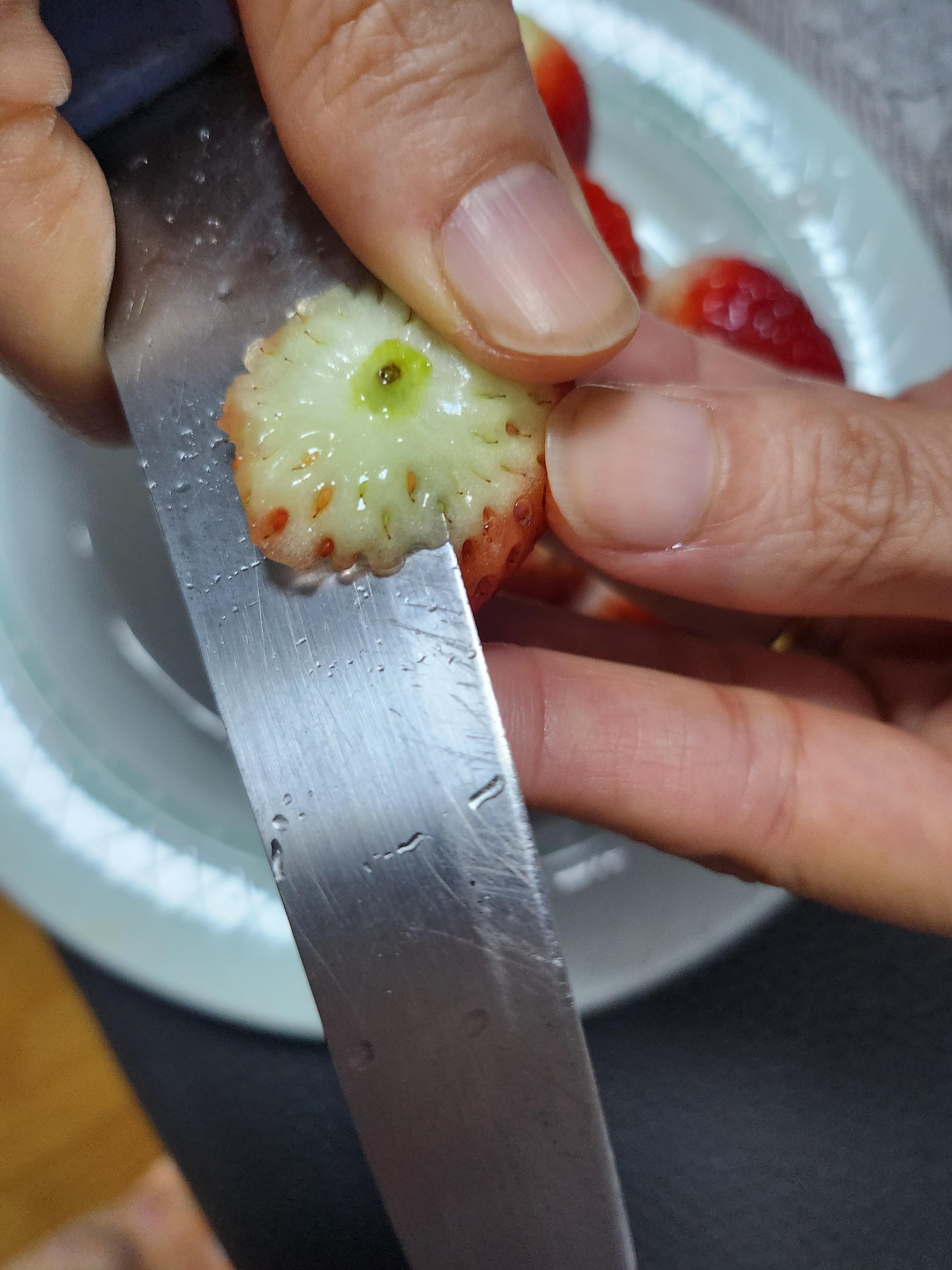 칼로 꼭지를 먼저 자르게 되면 씻을 때 잘린 부분으로 물이 들어가 딸기의 맛과 당도가 떨어지기 때문에 손으로 먼저 꼭지를 따주는 것이다.