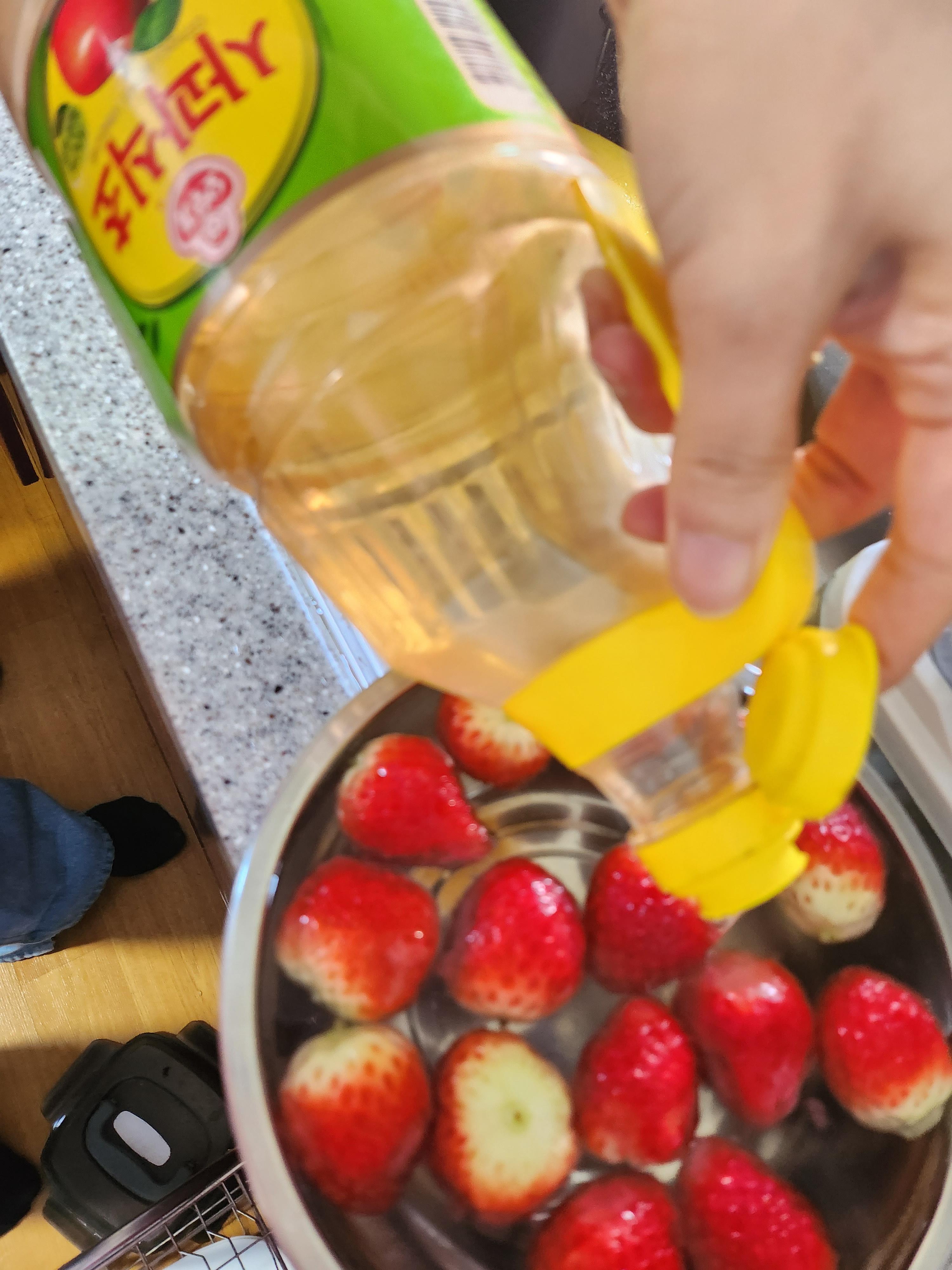 꼭지를 딴 딸기에 물을 가득 담고 식초 한 스푼 부어준다.