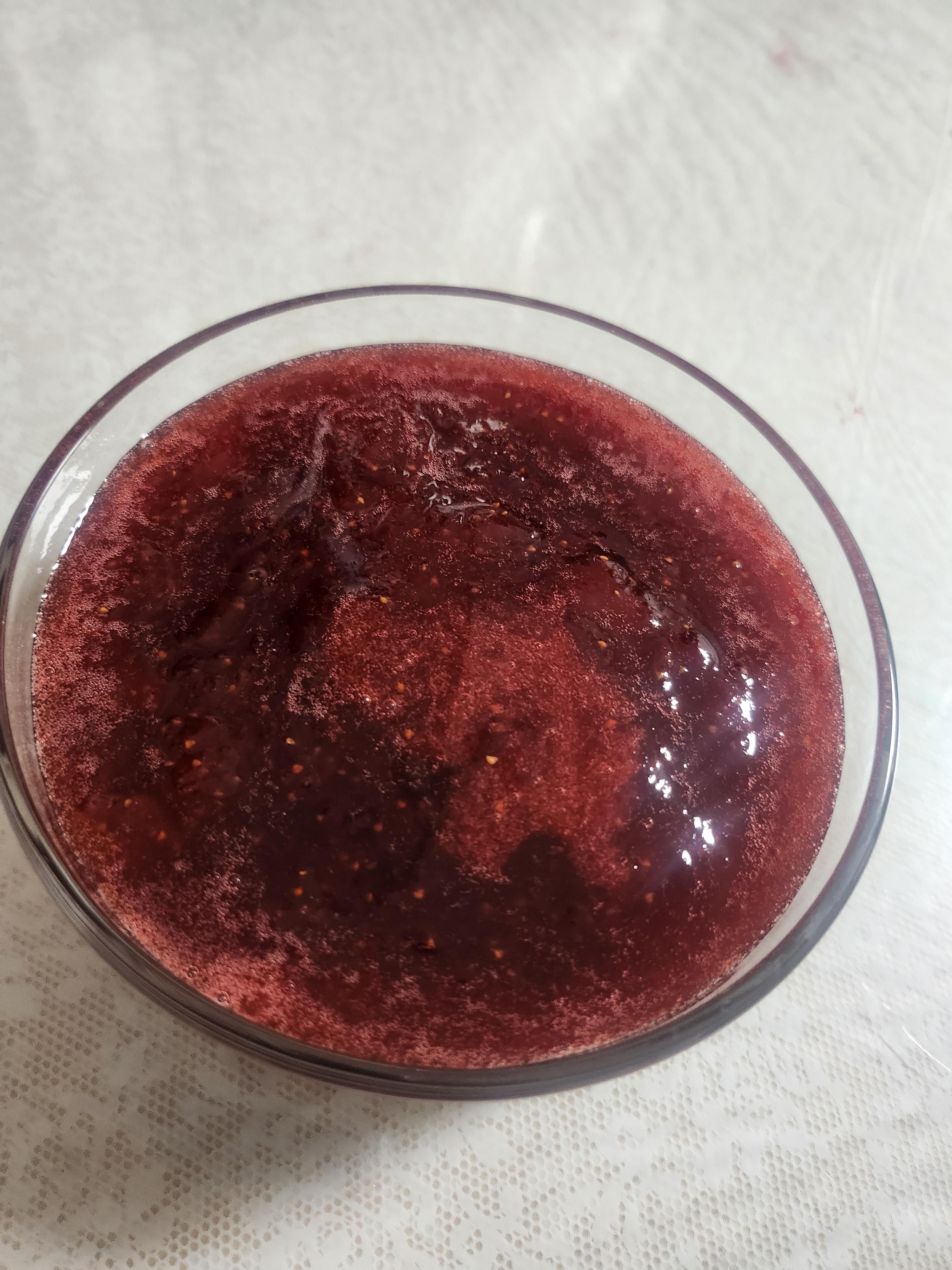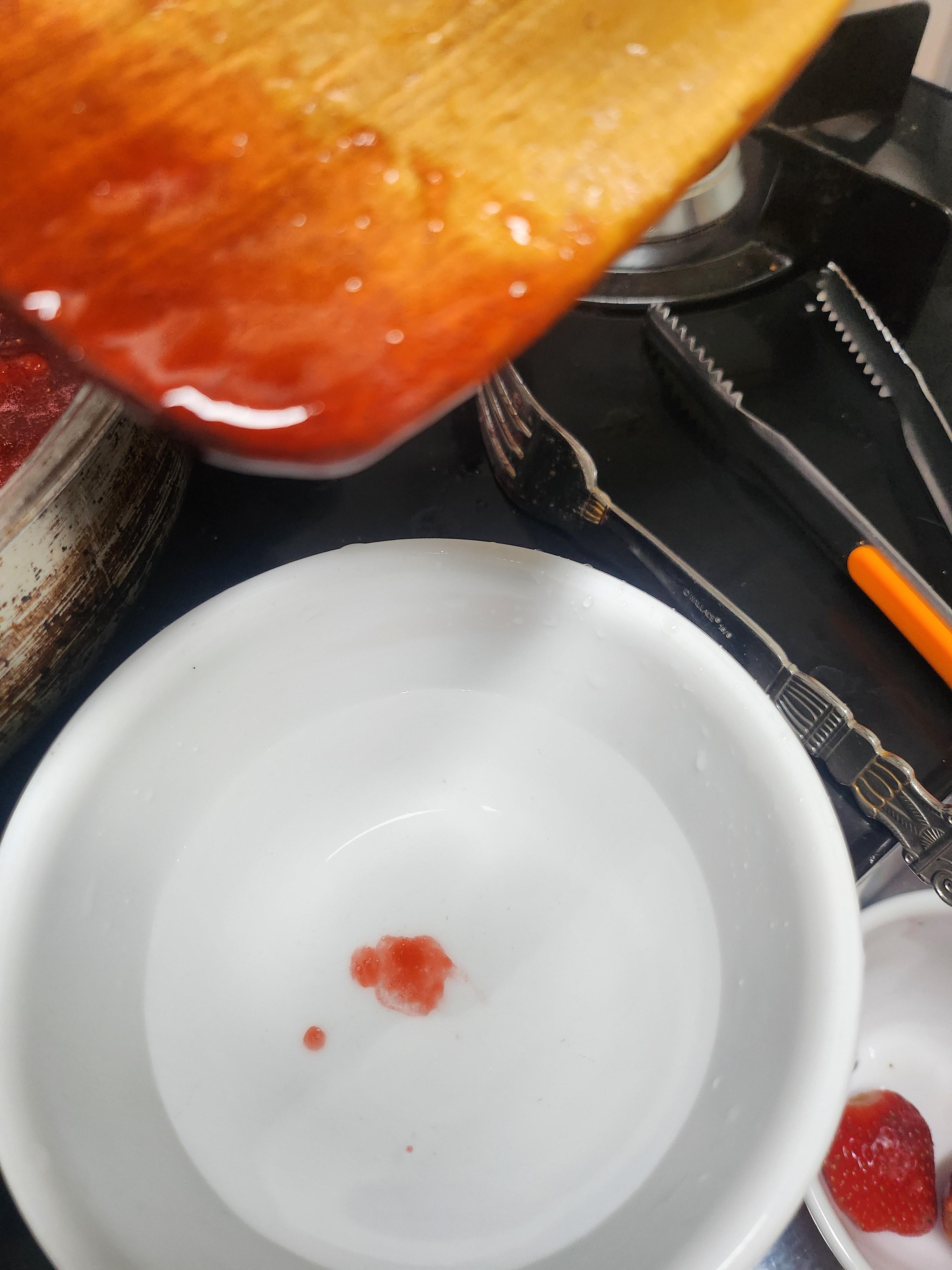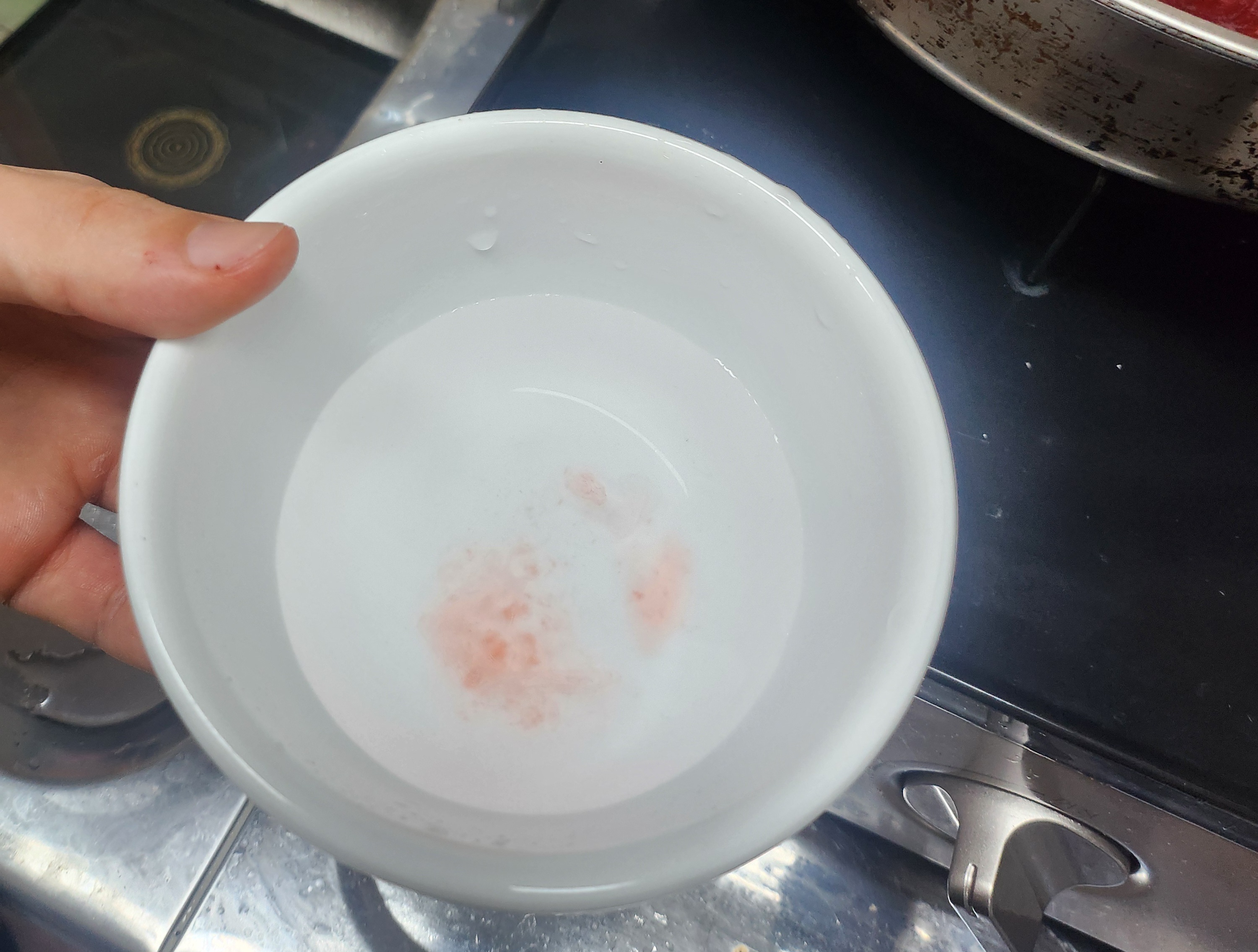 완성이 덜 된 잼은 물에 떨어뜨리면 물속에서 이렇게 풀어진다.