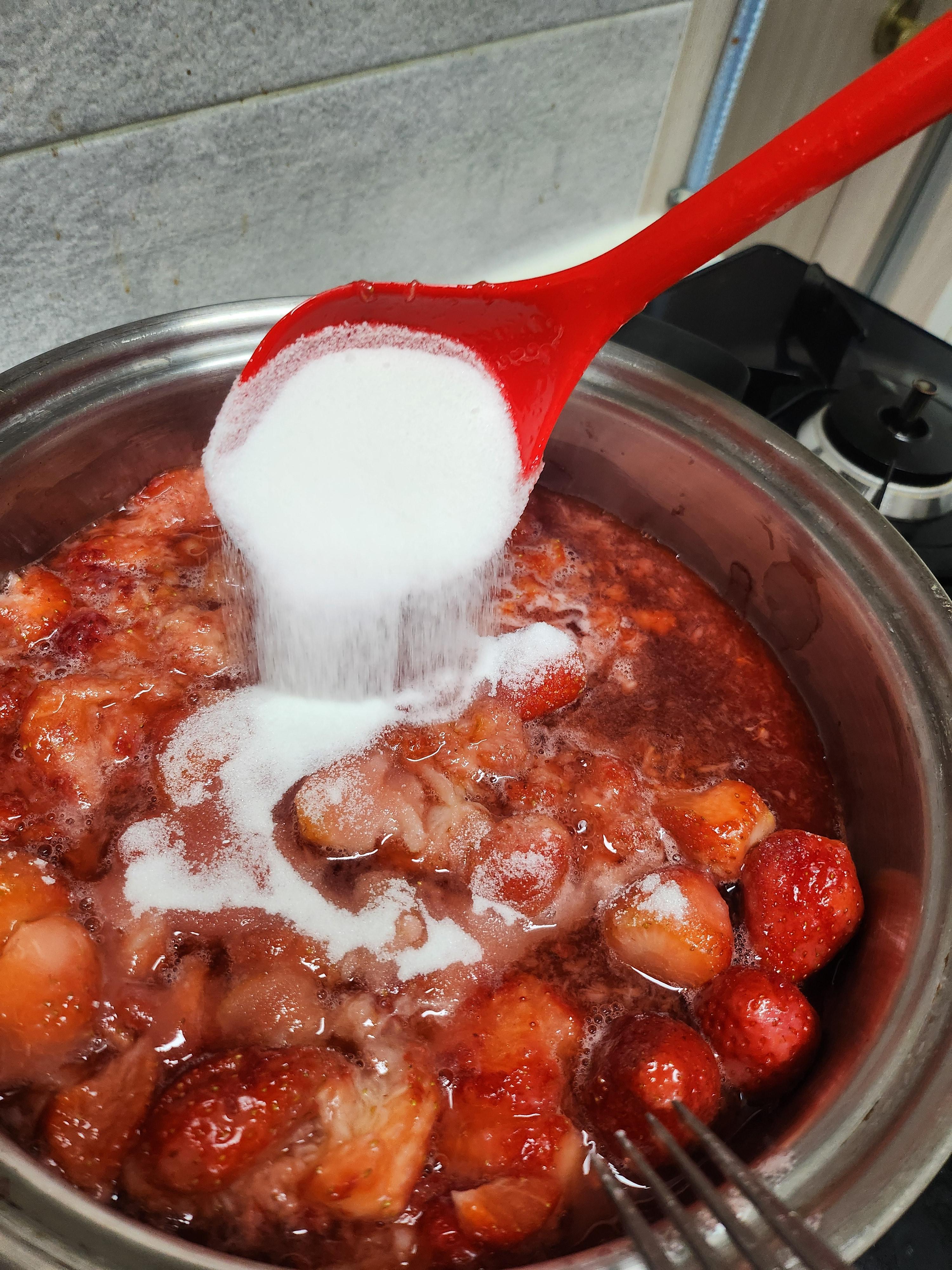 설탕은 딸기와 동일비율이지만 많이 단 것이 싫으면 80퍼센트 정도만 넣고 끓인다.