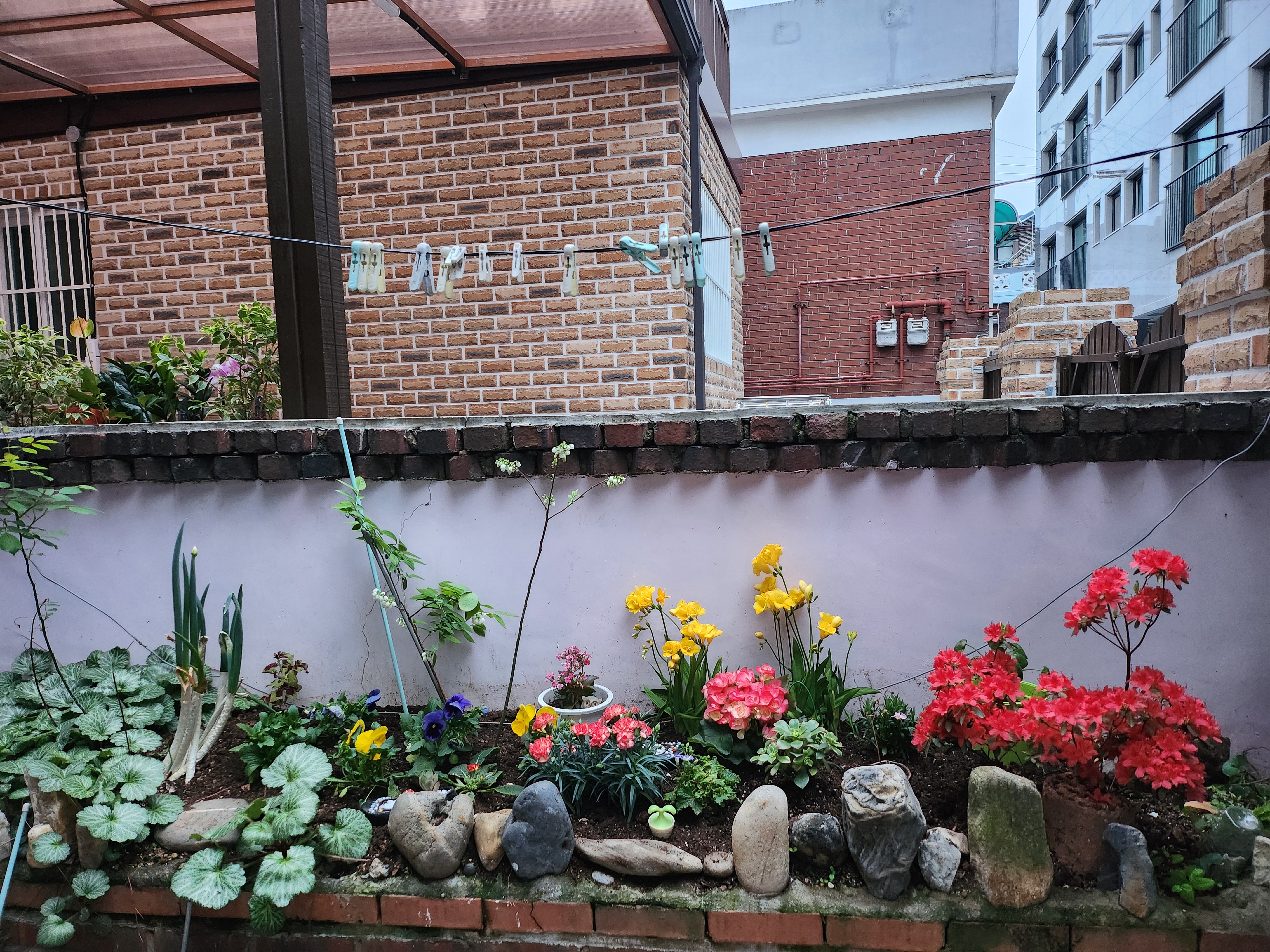 기존에 심어있던 왼쪽의 돌목련과 오른쪽의 다홍색 철쭉과 가운데의 키 큰 블루베리 꽃까지 한데 어우러져서 화단이 내가 원했던 그리고 엄마가 원했던 꽃밭으로 변신했다.