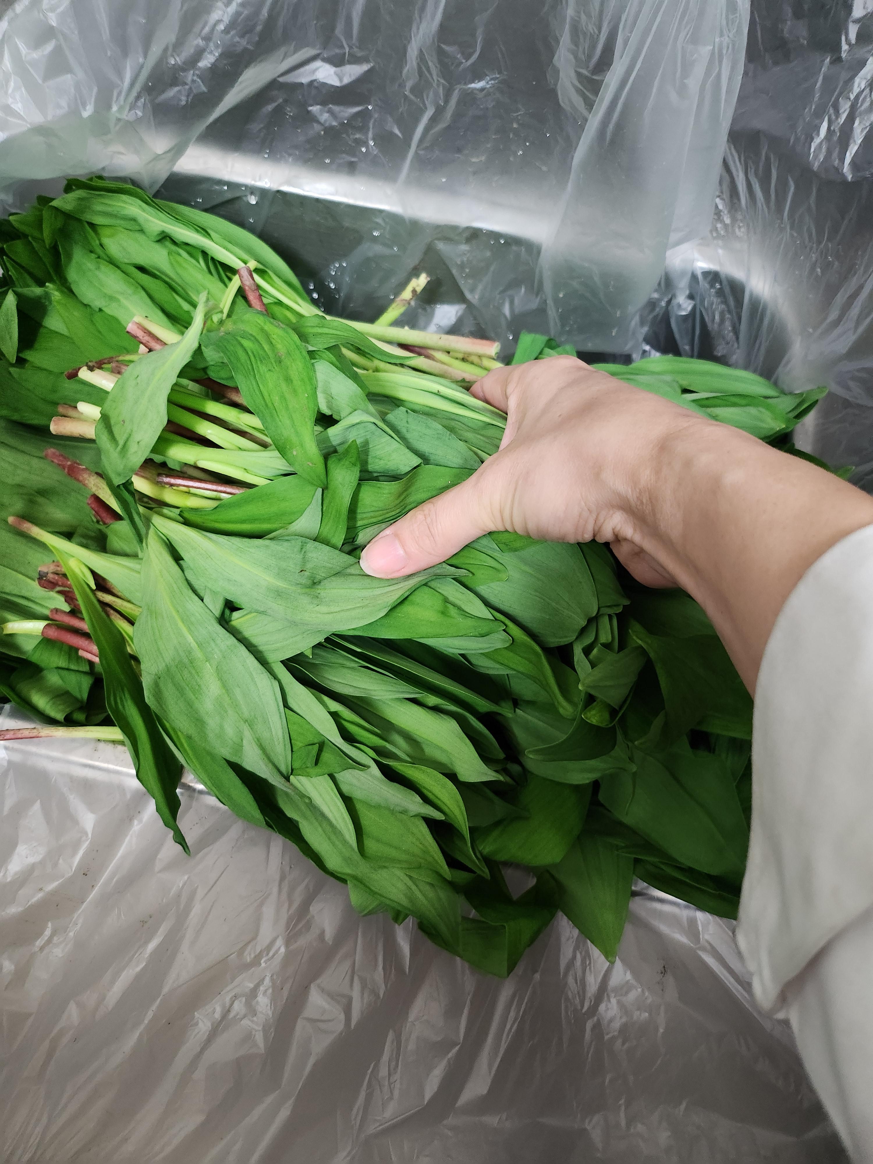 비닐에 담겨있는 명이나물을 꺼내어 큰 볼에 물을 잔뜩 받고 흐르는 물에 씻어야 묻어있는 흙이 잘 제거된다.
