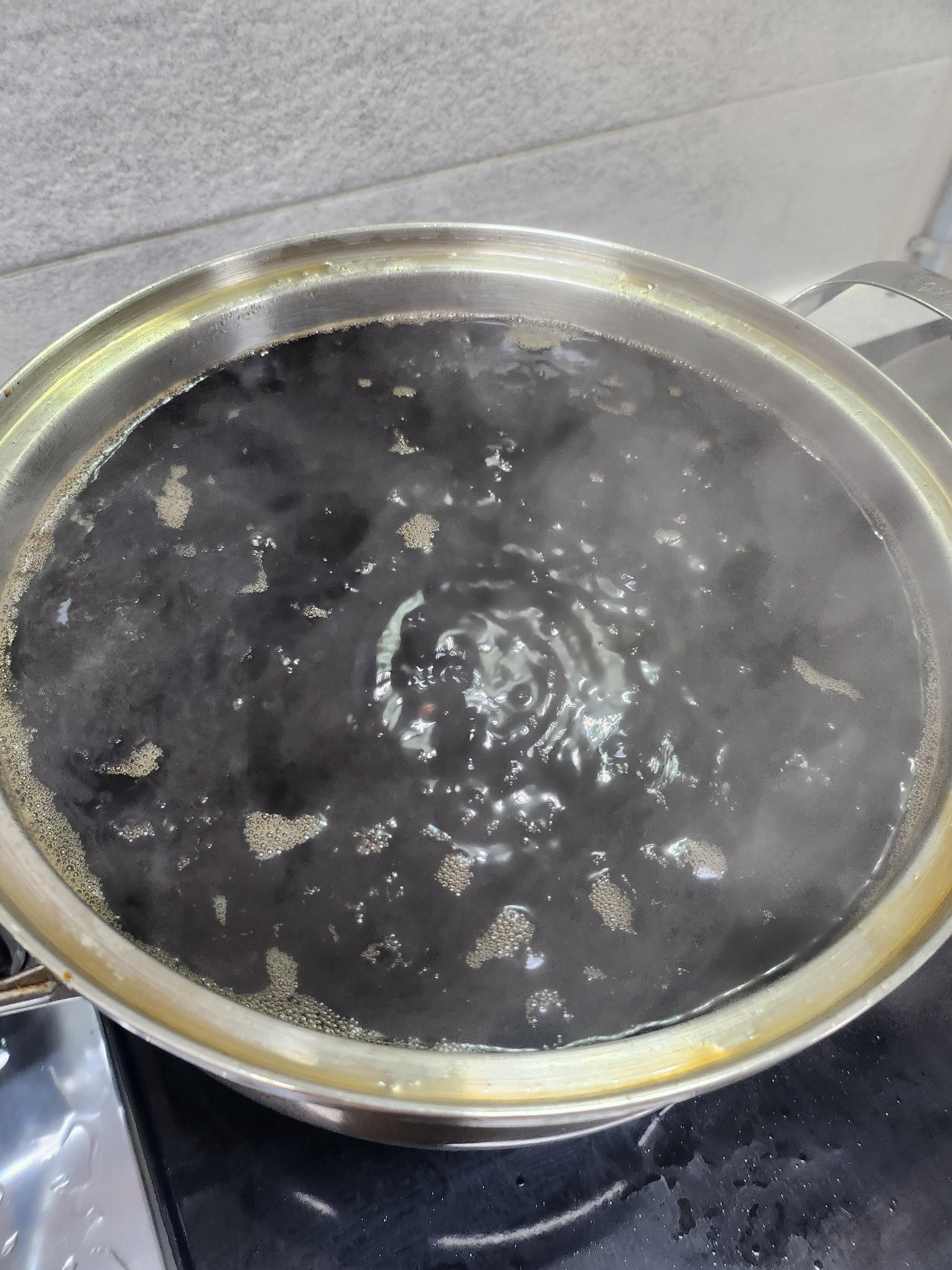 명이나물 자체에서 나온 수분까지 합해지니 꽤 많은 양의 간장이 나와 한솥이 되어 팔팔 끓여줬다.