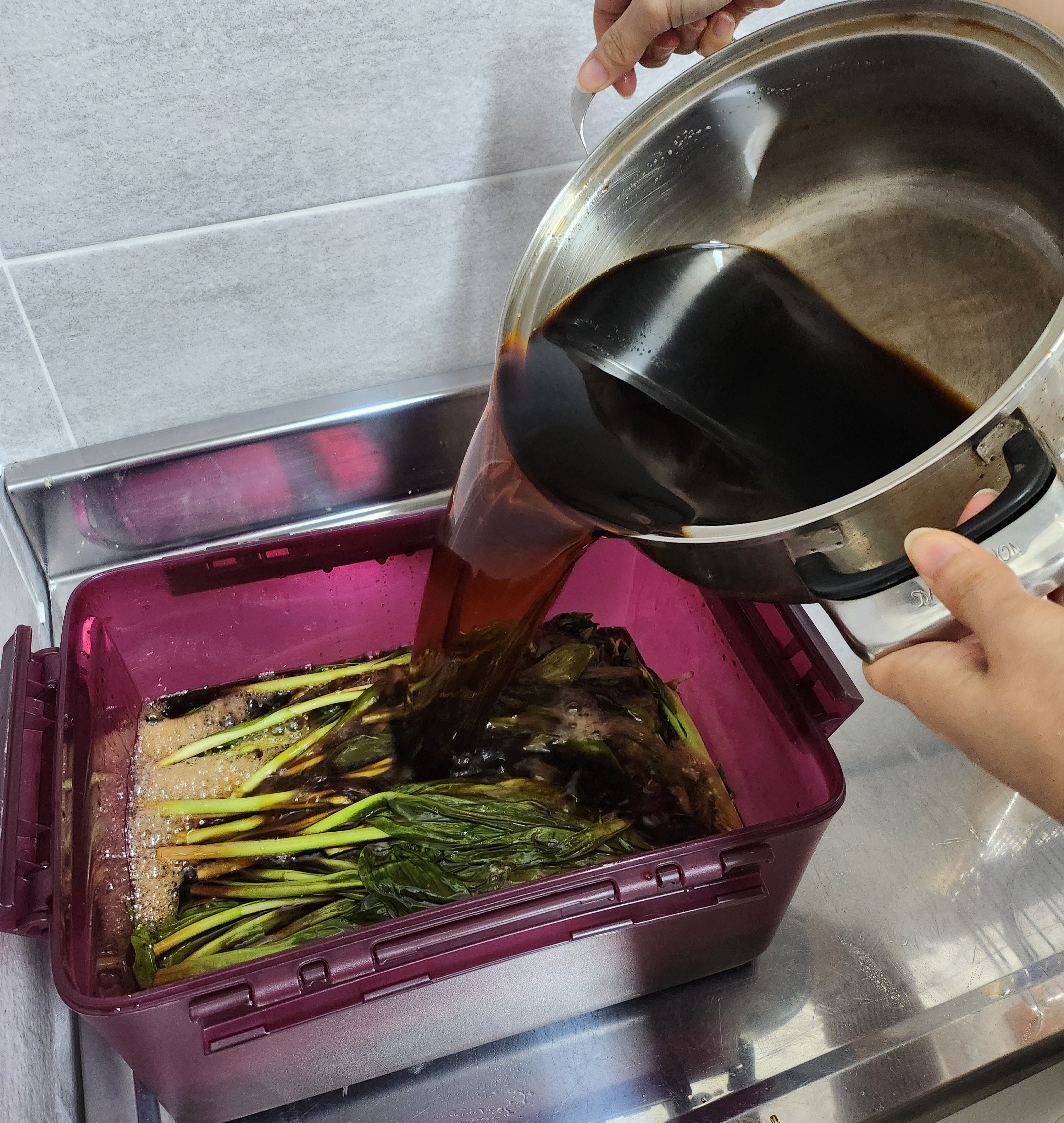팔팔 끓인 간장을 한 김 식힌 다음 다시 명이나물에 부어준다.