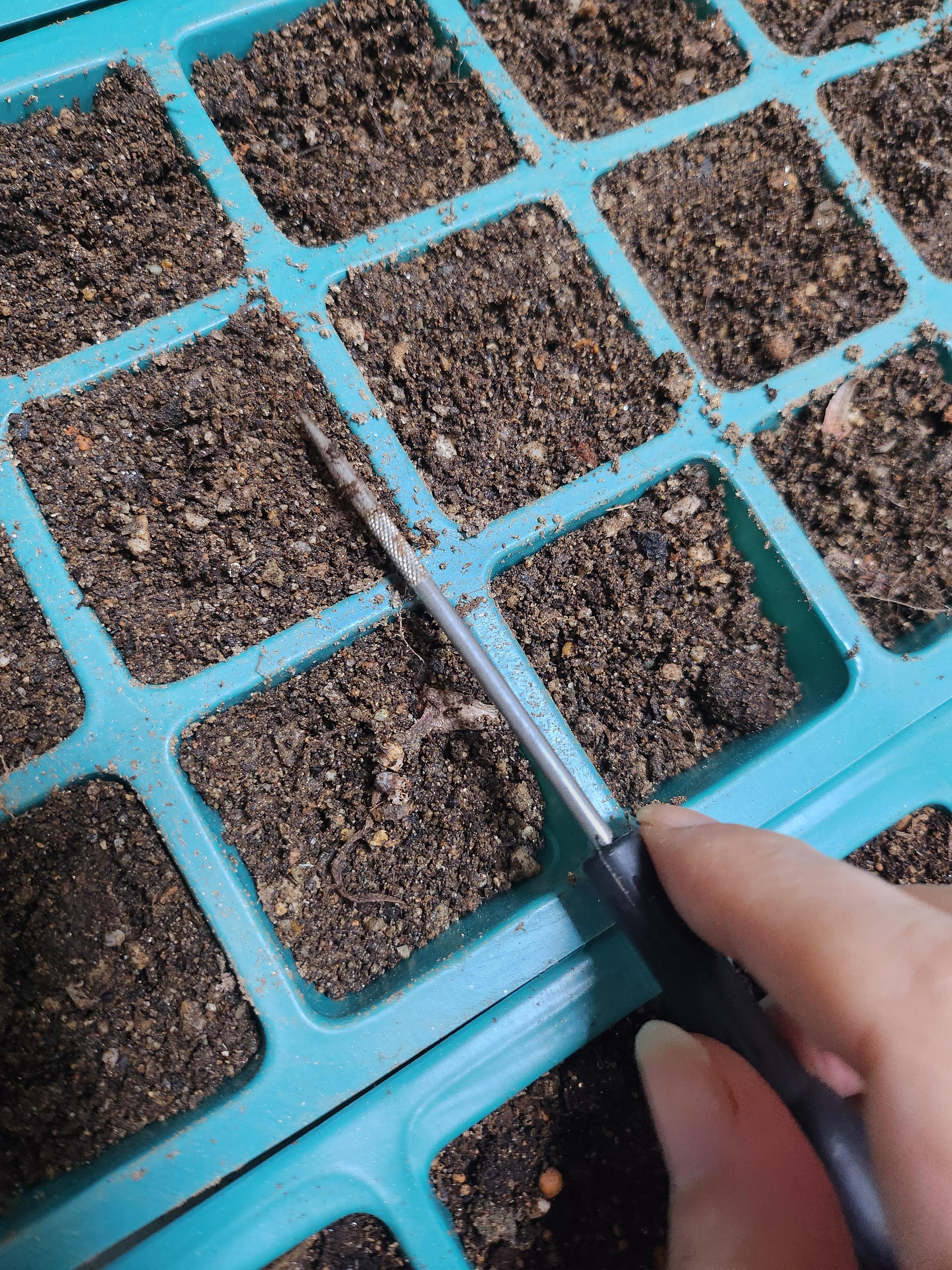 송곳이나 연필등으로 작은 2~3개의 구멍을 내주는데 너무 깊지 않게 해야 한다. 씨앗의 2~3배 깊이 정도로 얕게 심어준다.