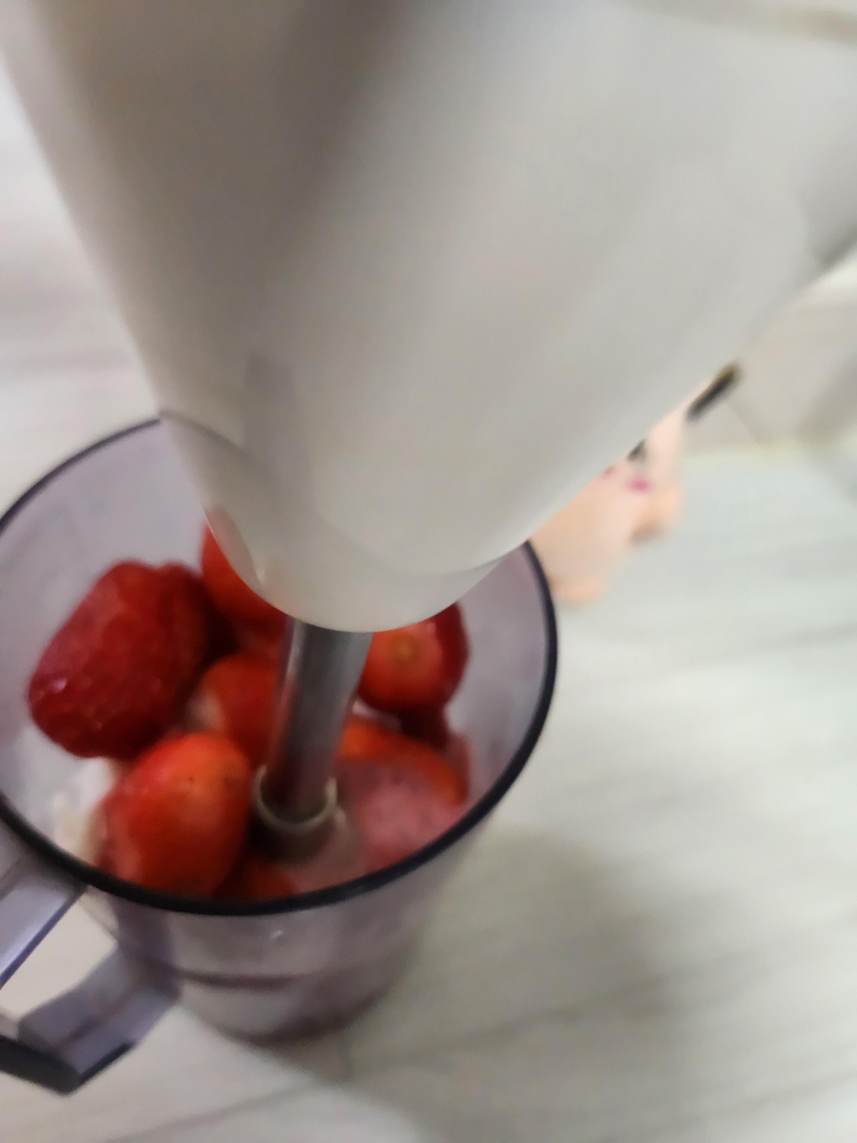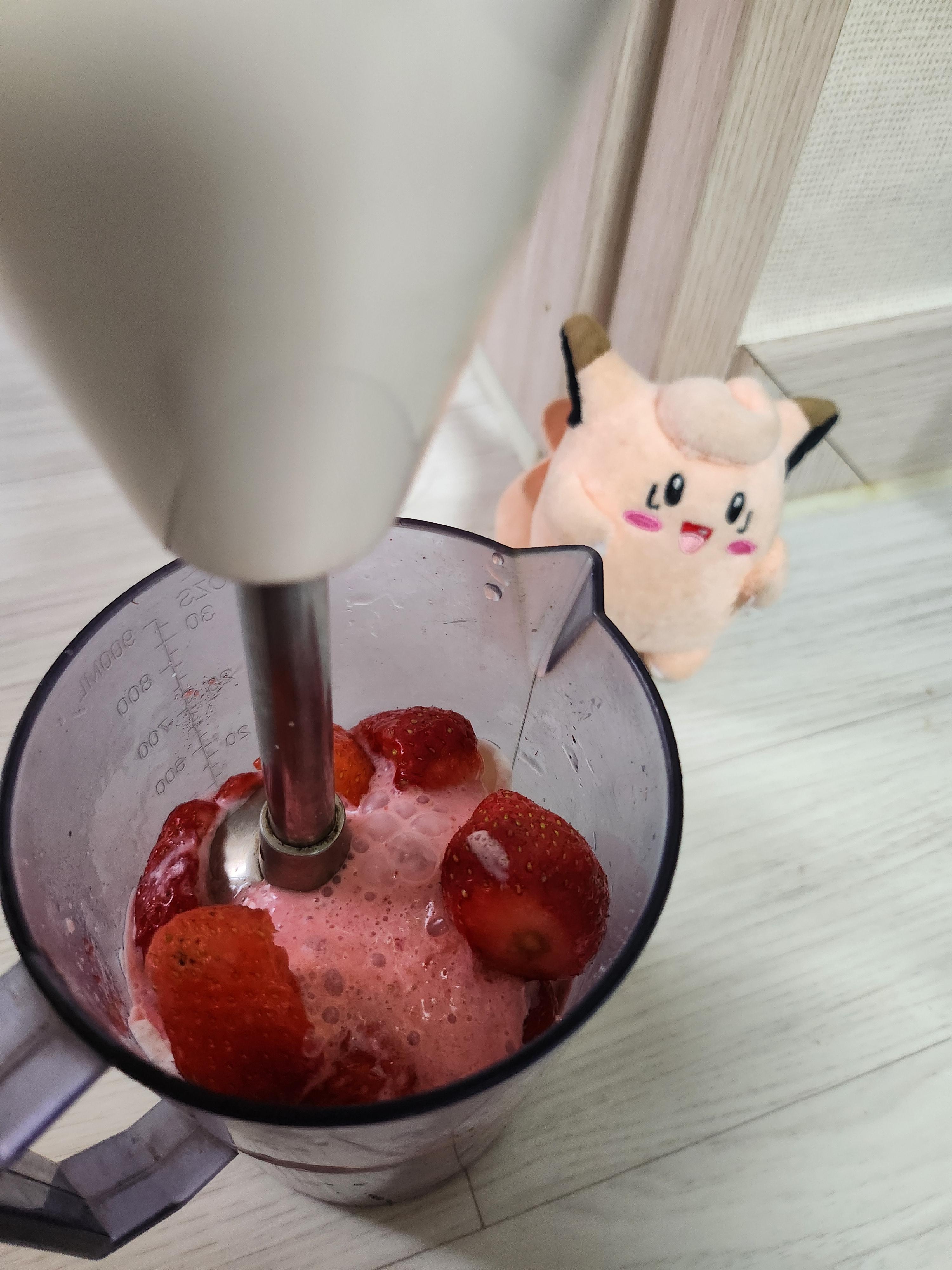 아래쪽에 얼린 요거트 3개와 적당량의 딸기를 위에 올려주고 도깨비방망이로 갈아준다.