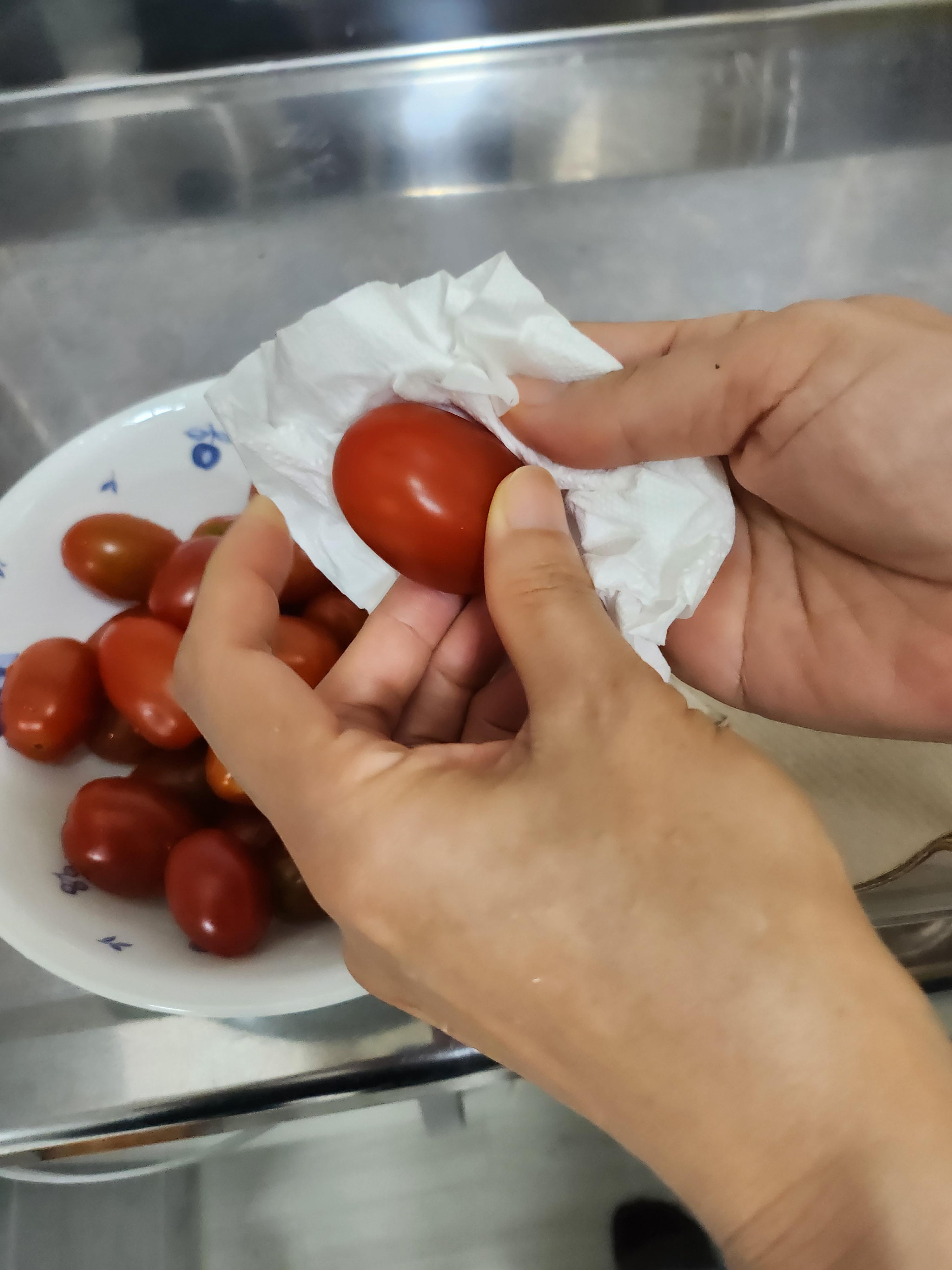 물기가 남아있는 방울토마토를 키친 타올로 한 개씩 깨끗이 닦아준다.