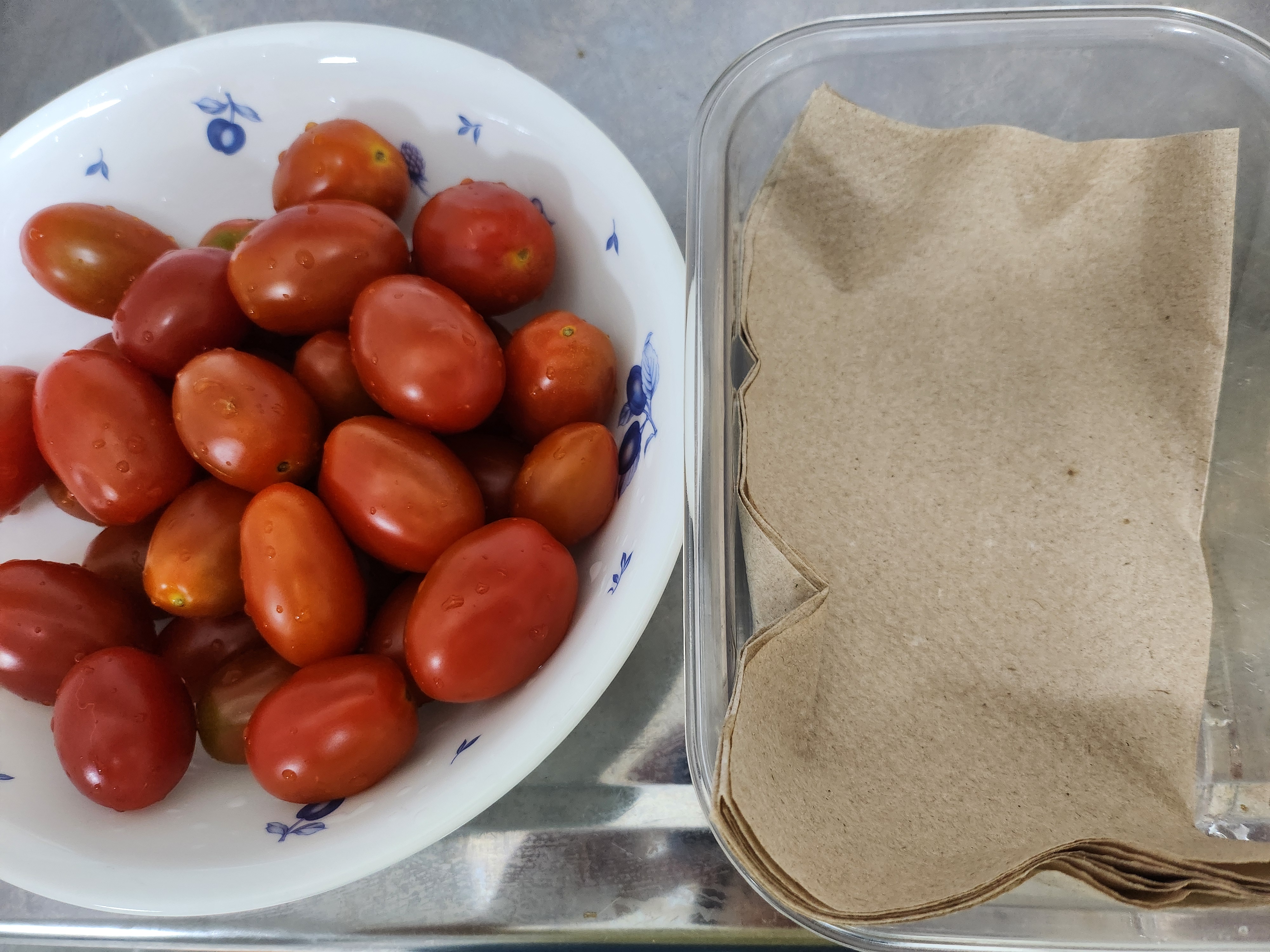 위쪽도 키친타월을 올려주고 뚜껑을 닫아 습기가 뚜껑에 맺히지 않게 해서 최대한 물기가 토마토에 묻지 않게 한다