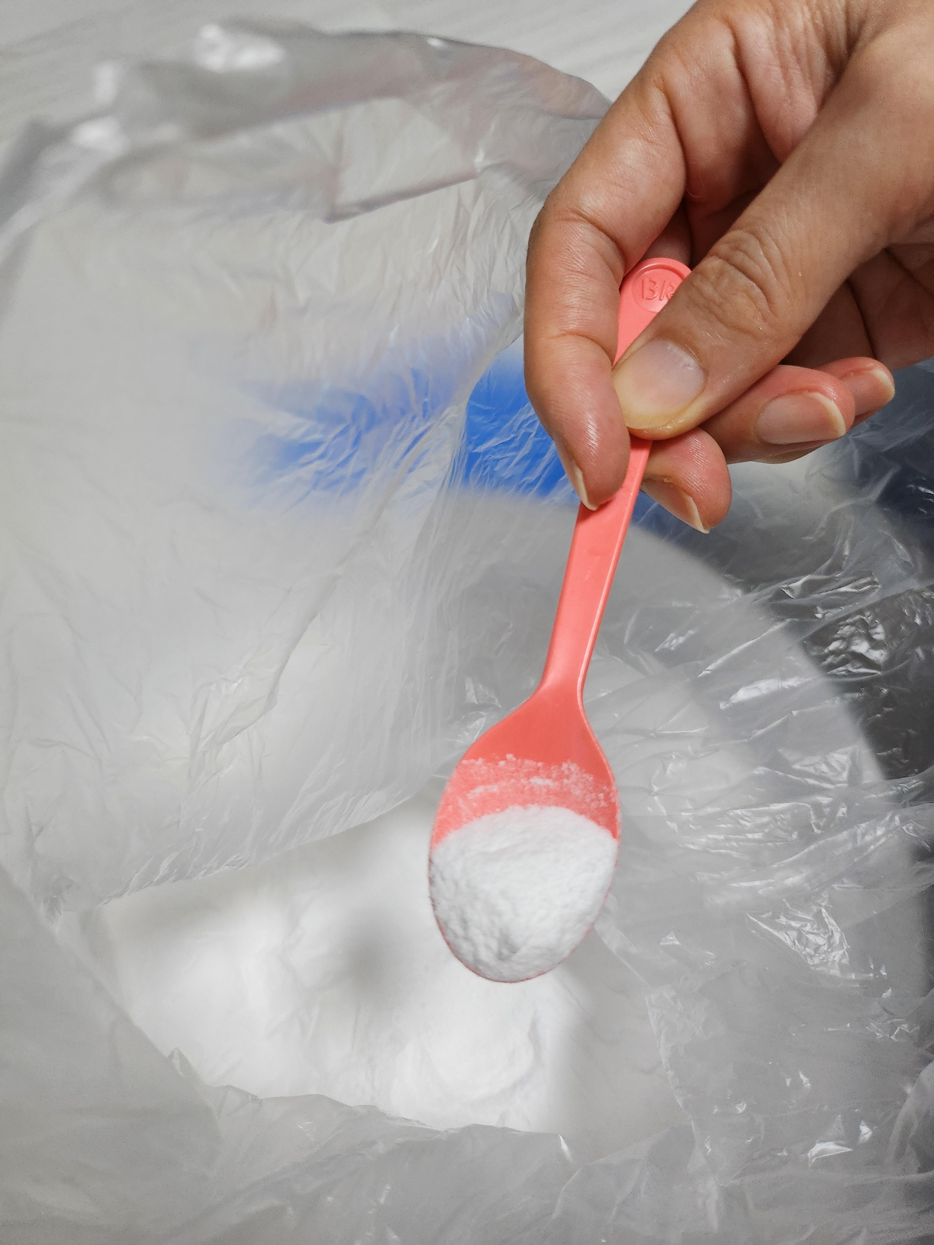꼭지를 딴 방울토마토를 물에 담그고 베이킹소다 한 스푼을 떠서 물에 풀어준다.