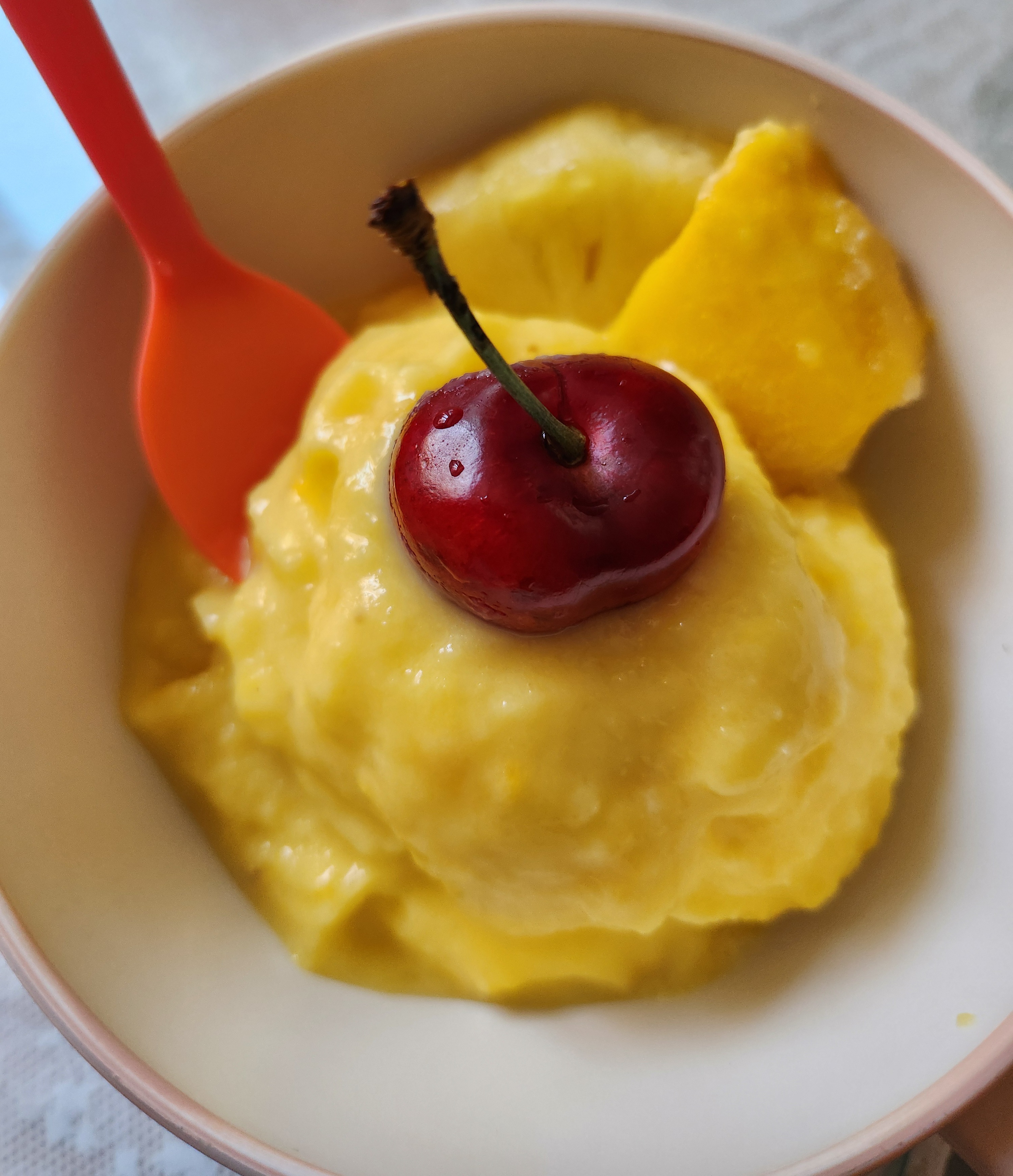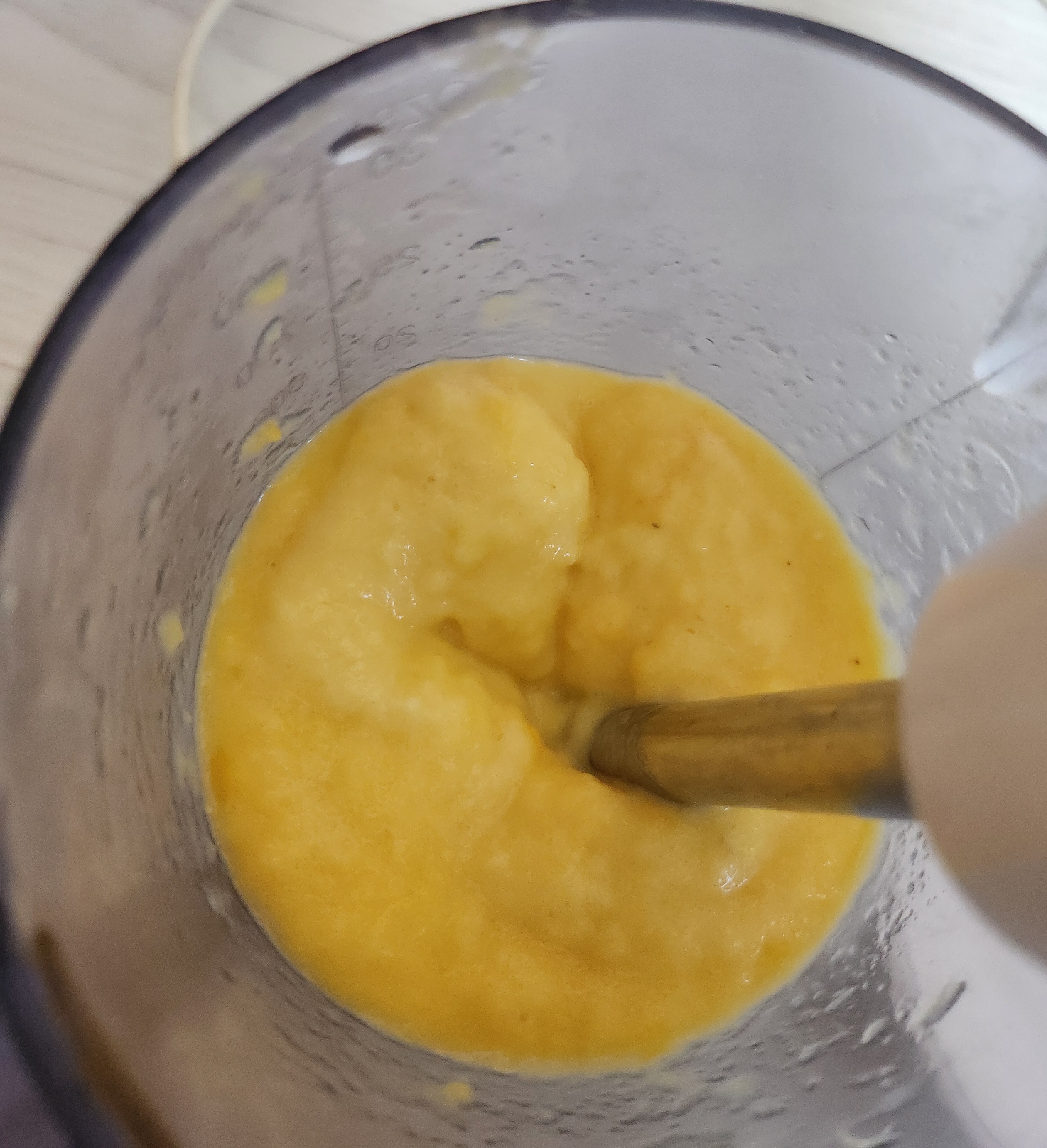 아래쪽에 얼린 망고와 위에 생파인애플을 넣고 갈다가 어느 정도 갈리면 얼린 복숭아요거트를 넣고 같이 간다.