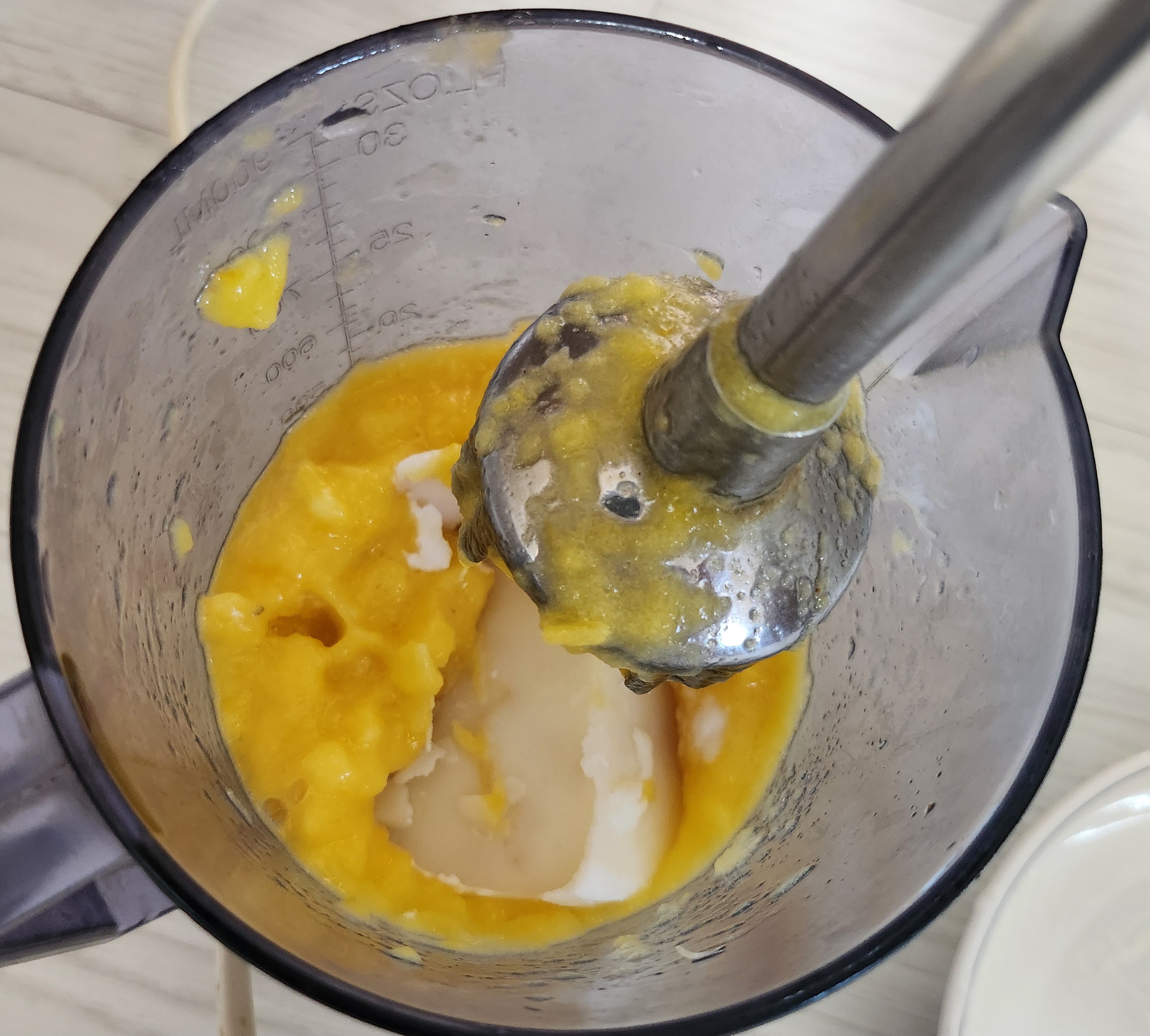 아래쪽에 얼린 망고와 위에 생파인애플을 넣고 갈다가 어느 정도 갈리면 얼린 복숭아요거트를 넣고 같이 간다.