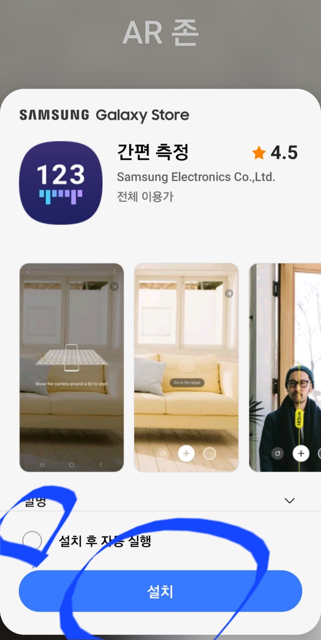 완료되었으면 카메라기능을 실행해서 더보기의 AR존에 간편 측정을 누르면 길이 측정이 가능해진다.