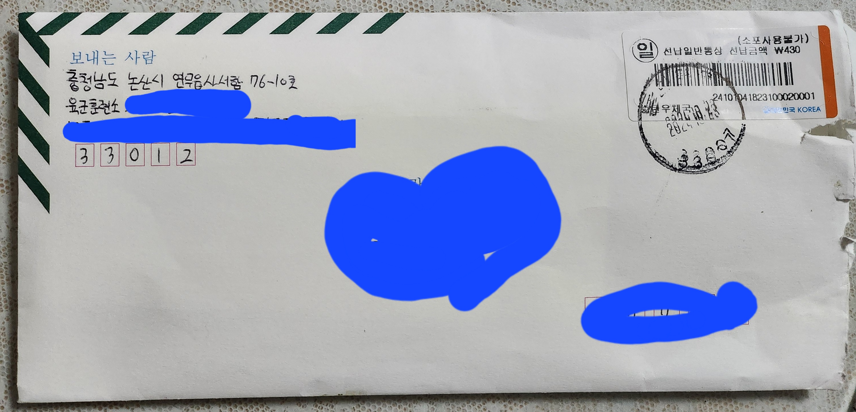 충청남도 논산시 연무읍사서함 76-10호 육군훈련소 00교육연대 0교육대 00중대 0소대 0분대 000번 홍길동 훈련병