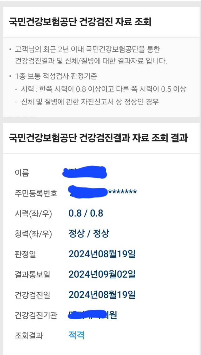 ※ 시력(교정시력)과 청력 좌우가 정상으로 나와야 통과됩니다.