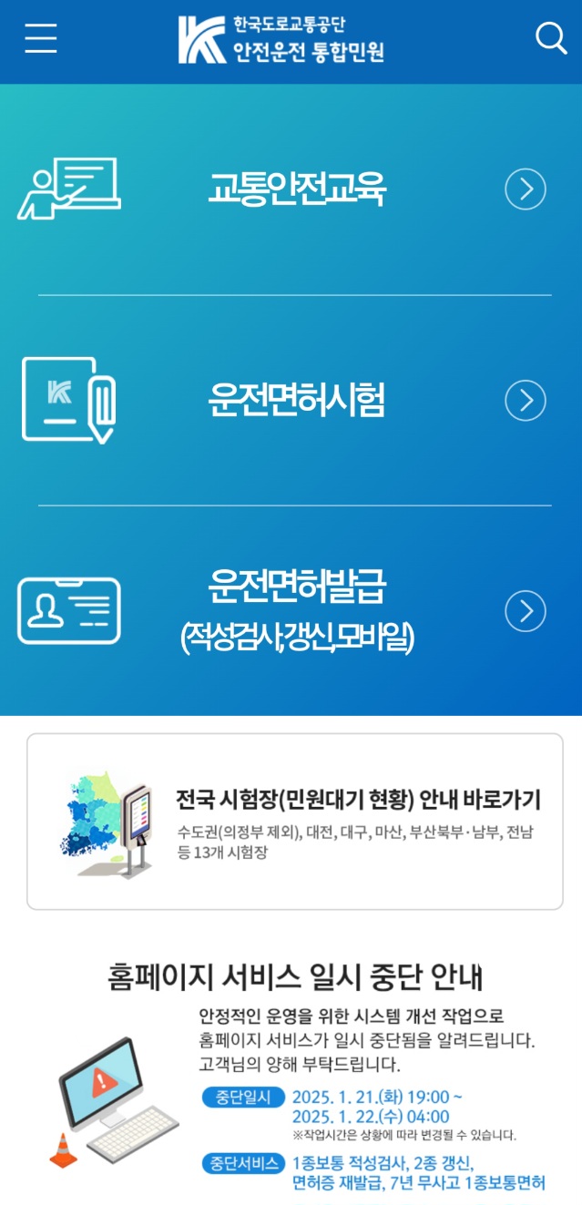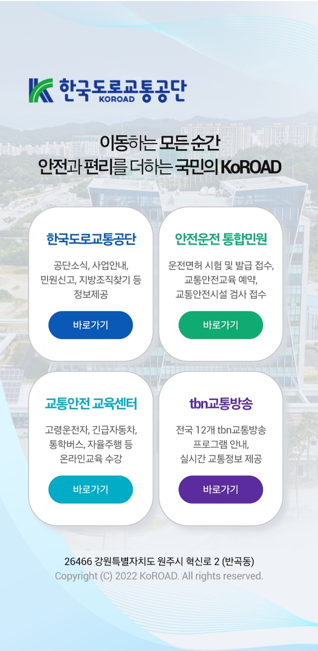 이동하는 모든 순간 안전과 편리를 더하는 국민의 KoROAD 한국도로교통공단 공단소식, 사업안내,민원신고, 지방조직찾기 등정보제공 바로가기 안전운전 통합민원 운전면허 시험 및 발급 접수,교