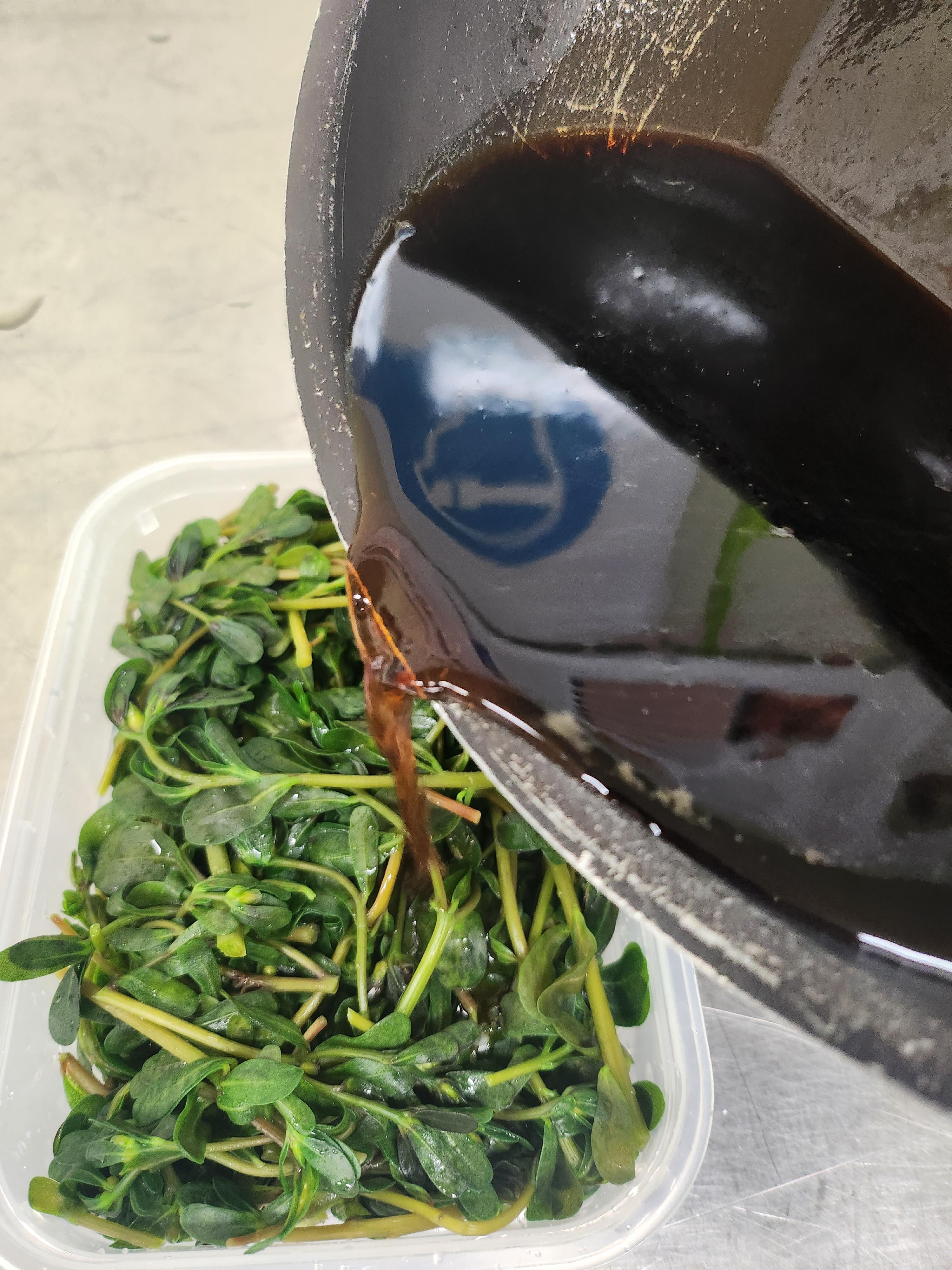 간장 1, 물 1, 식초 1, 설탕 0.5를 섞어서 팔팔 끓인 다음 간장물을 쇠비름에 붓는다.