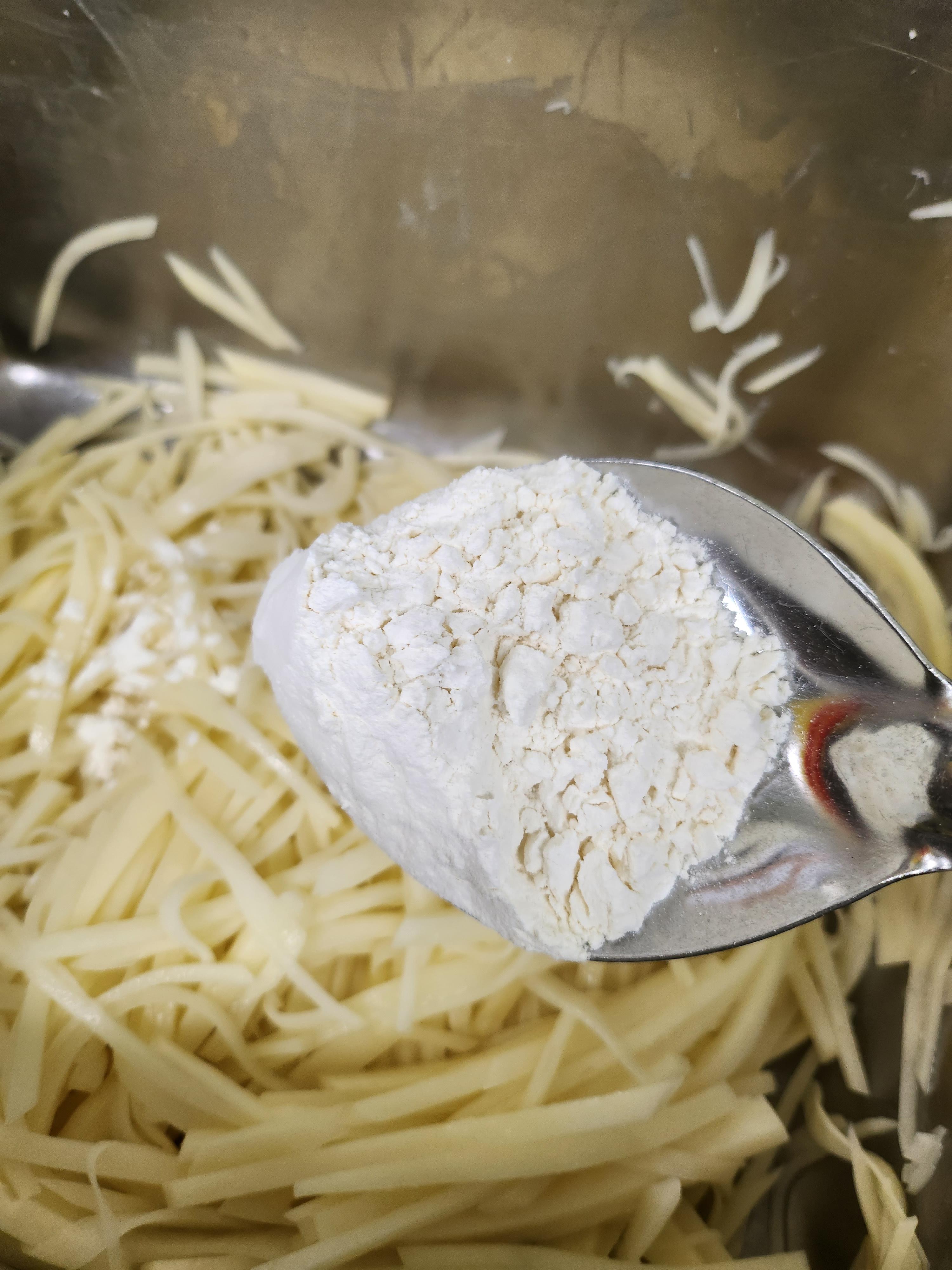 세 개의 감자채를 그릇에 담고 1 티스푼정도의 소금을 뿌려서 골고루 섞어준다. 빠른 변색도 막아주고 밑간도 된다.
