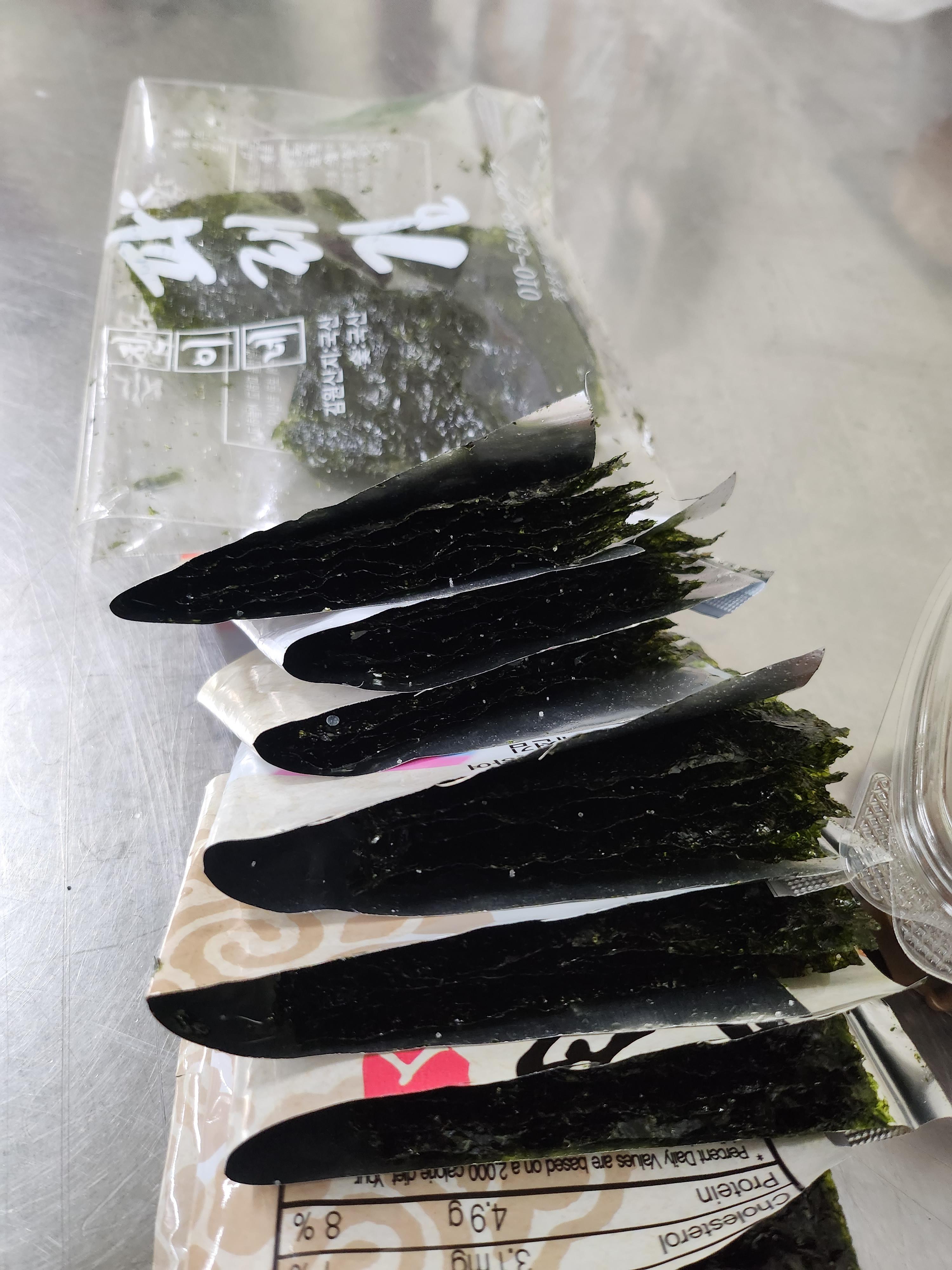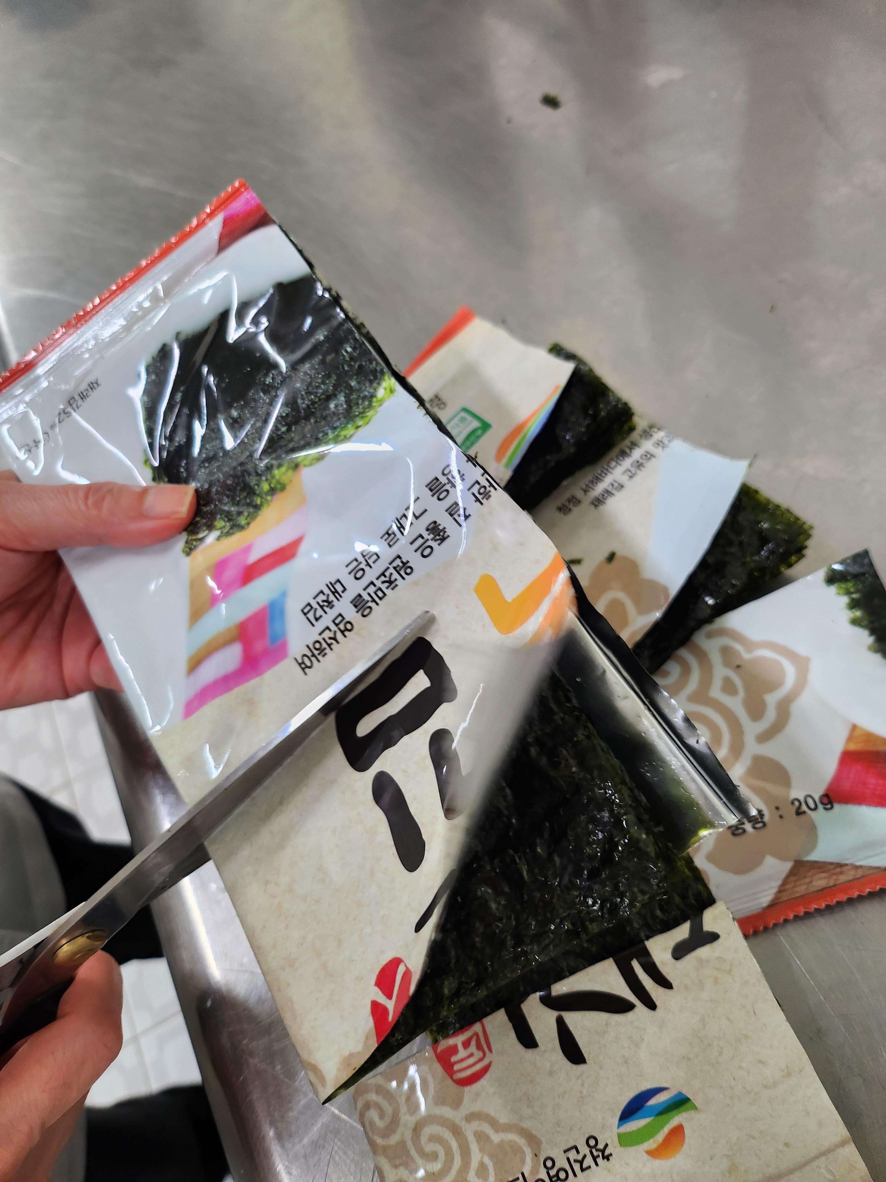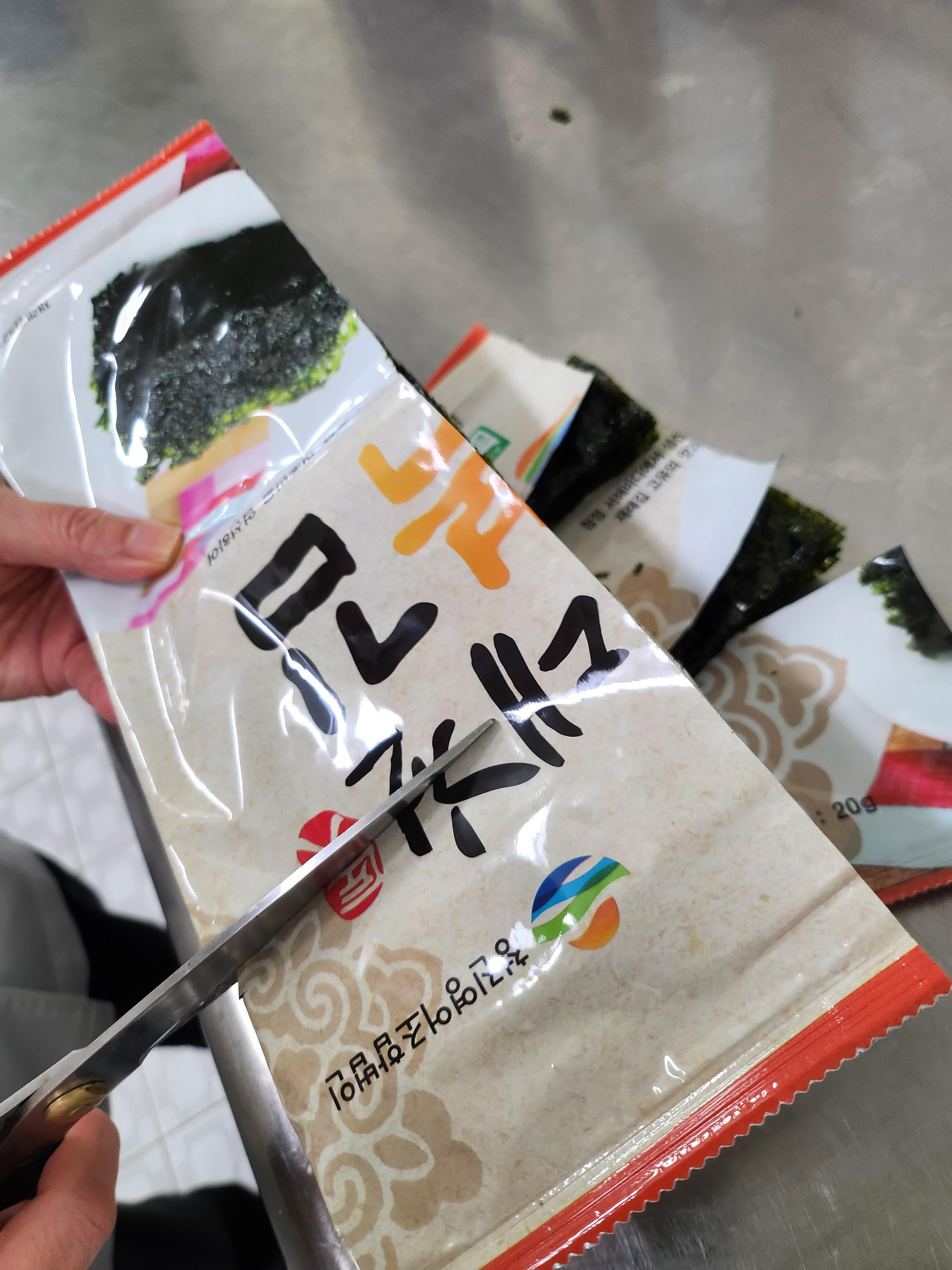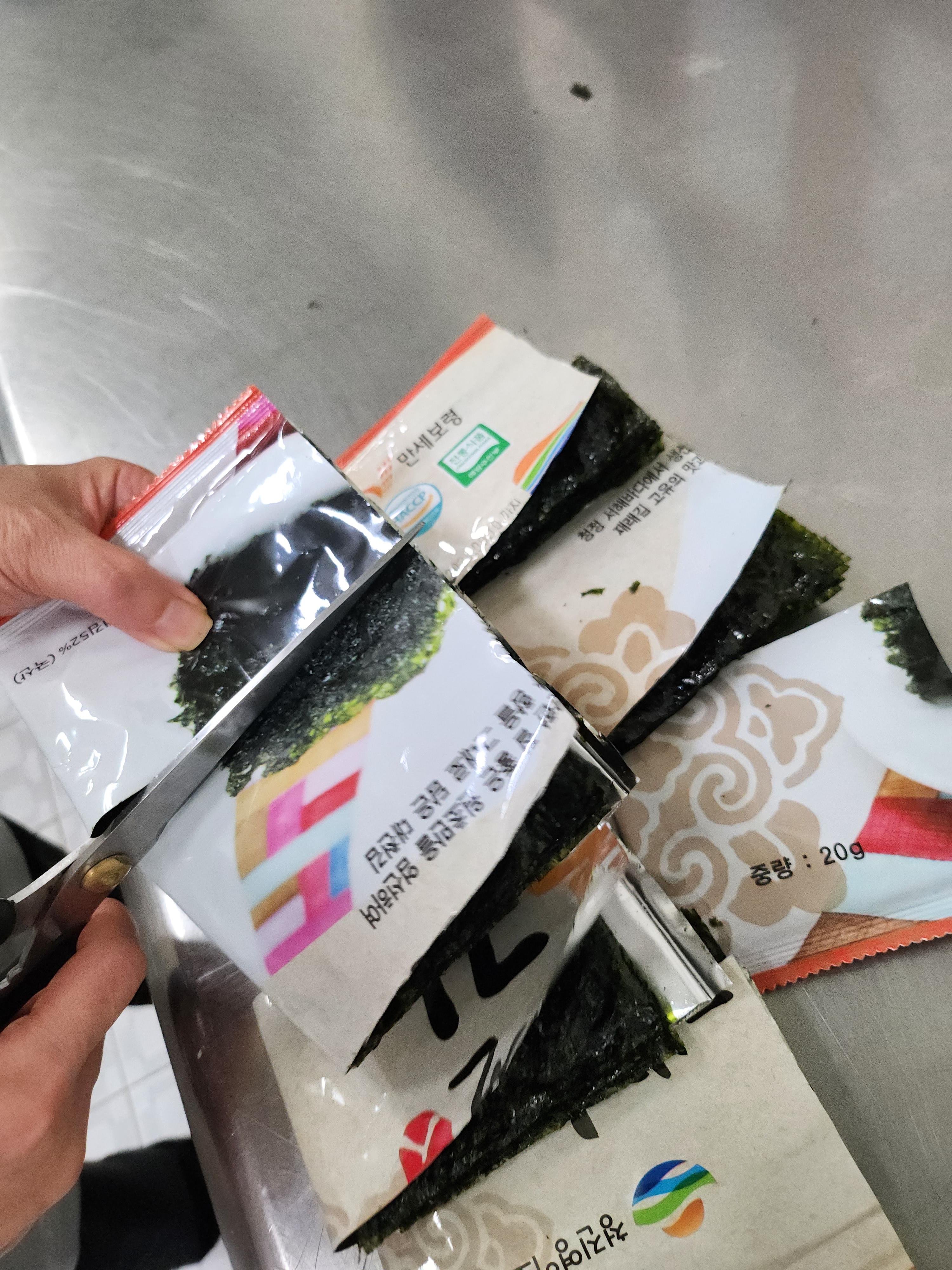 김의 제일 윗부분을 잘라내고 실리카겔을 먼저 꼭 빼내고 잘라야 한다.