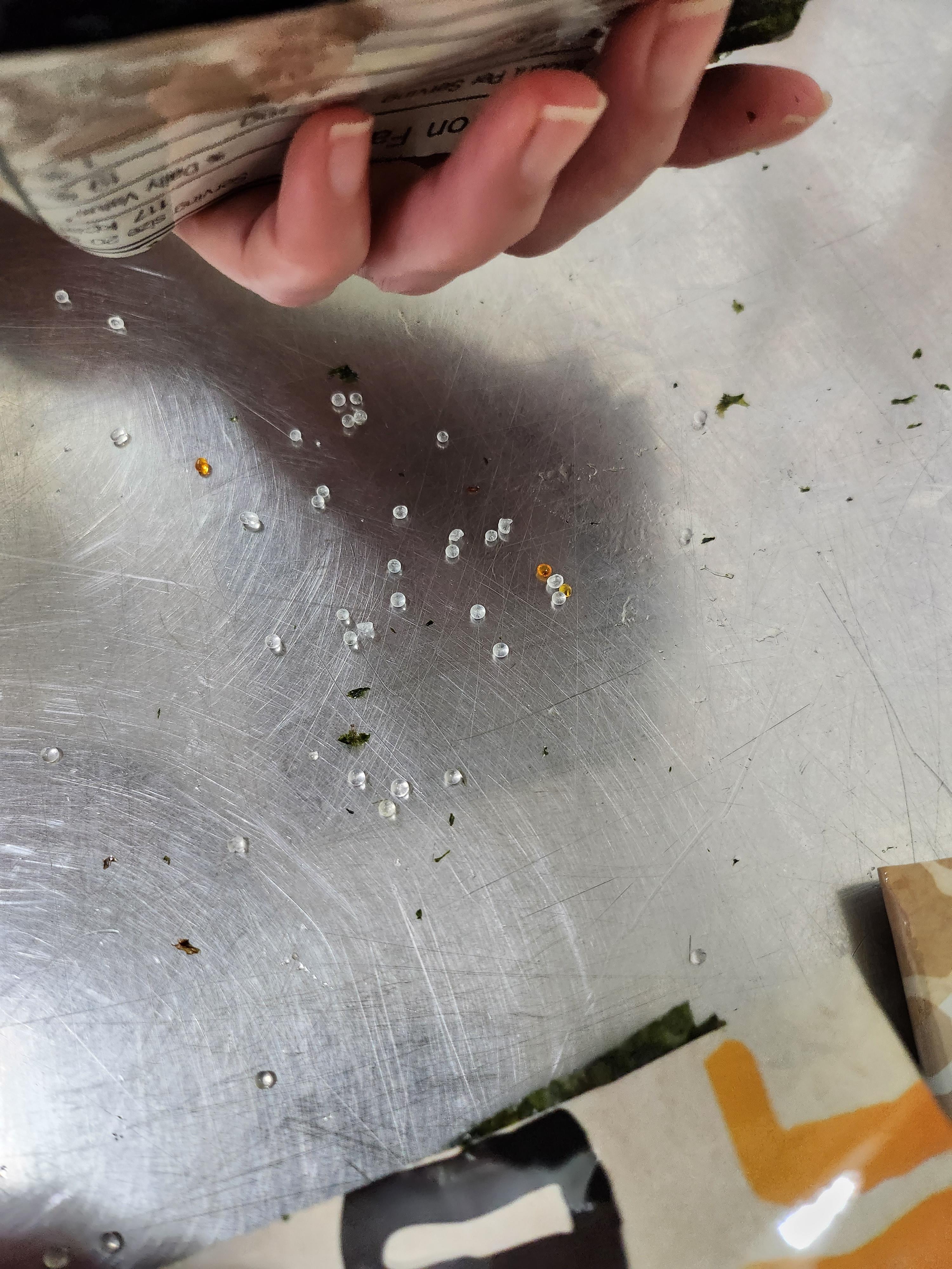 건조함을 유지하기 위해 들어가 있는 제습제(실리카겔)를 먼저 빼고 잘라야 했다.