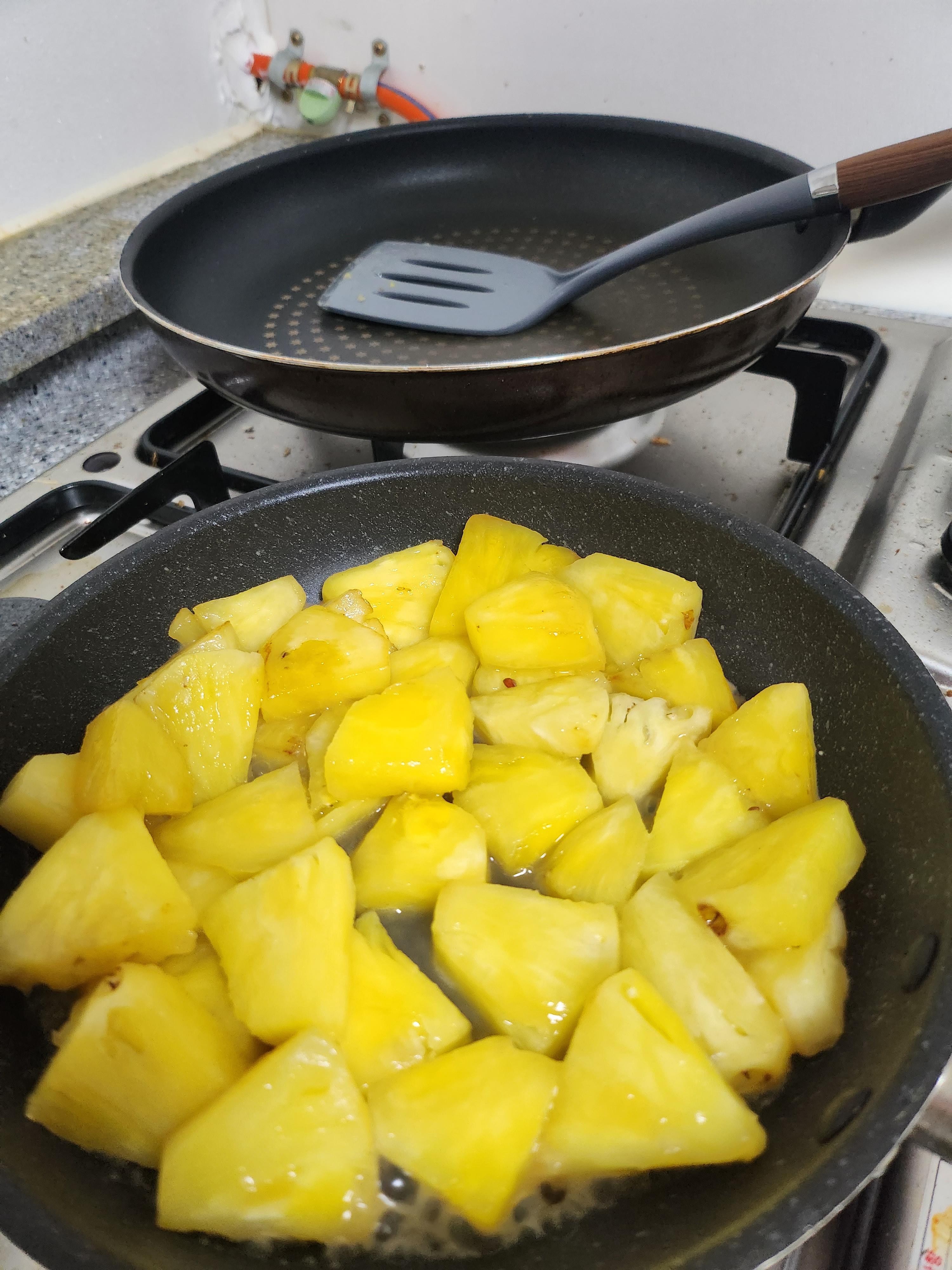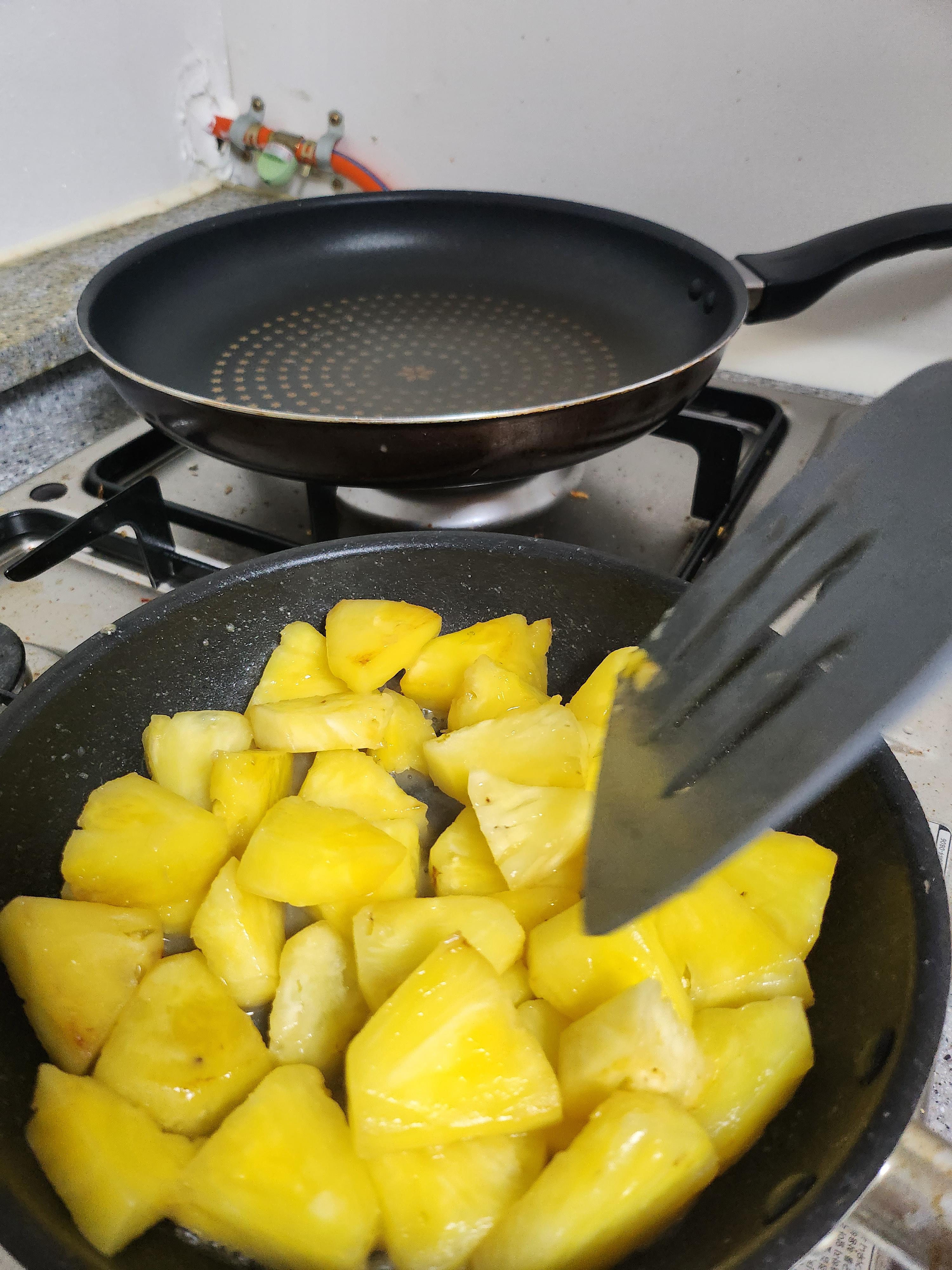 파인애플을 프라이팬에 넣고 기름을 살짝 두르고 열이 많이 올랐을 때 볶다가 소주를 뿌리듯이 겉들이고 볶으면 신맛이 감소하면서 단맛이 증가되고 소화에 도움이 된다.