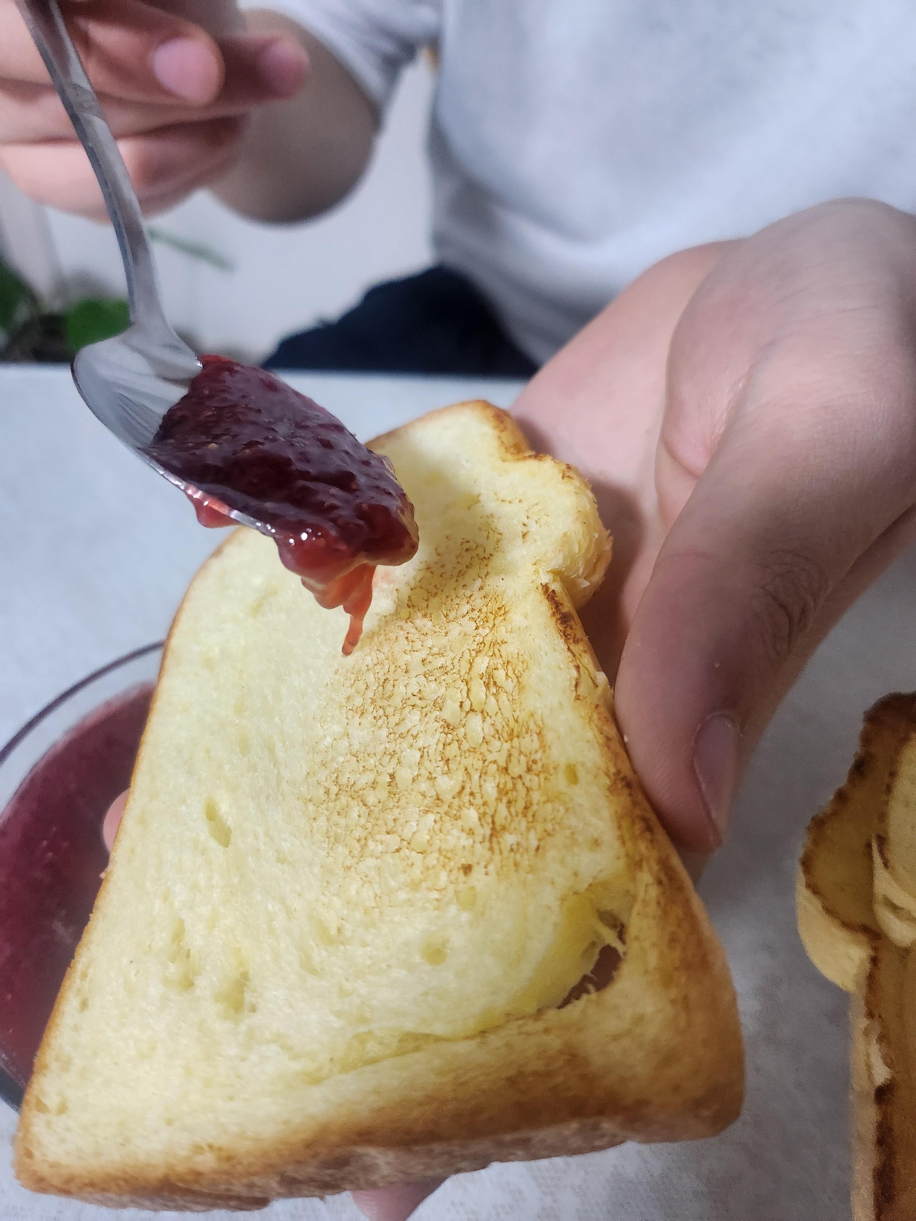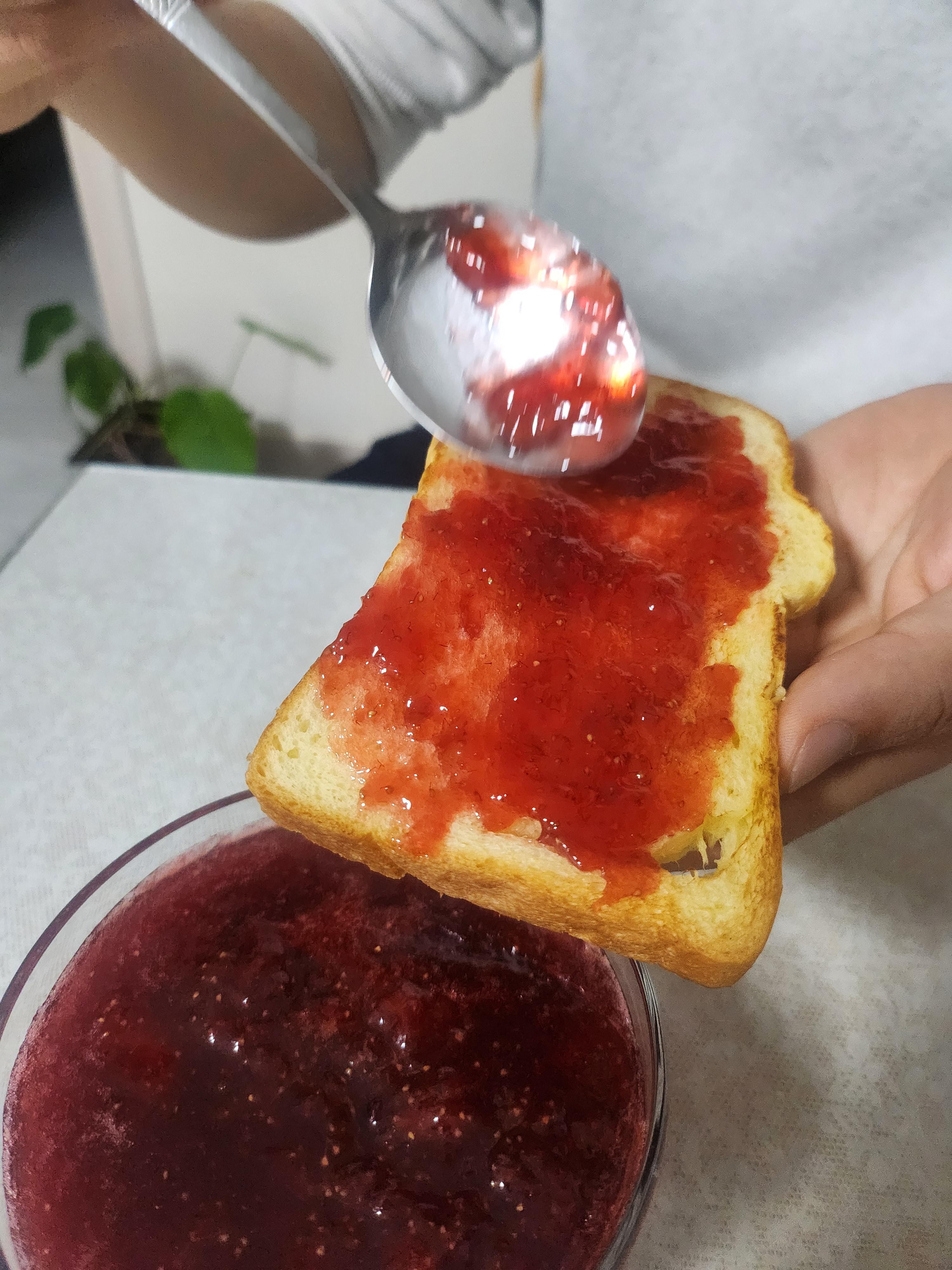 밤늦게 완성한 잼을 맛보기 위해 굳이 빵집 딸린 마트에 가서 빵까지 사 왔다.