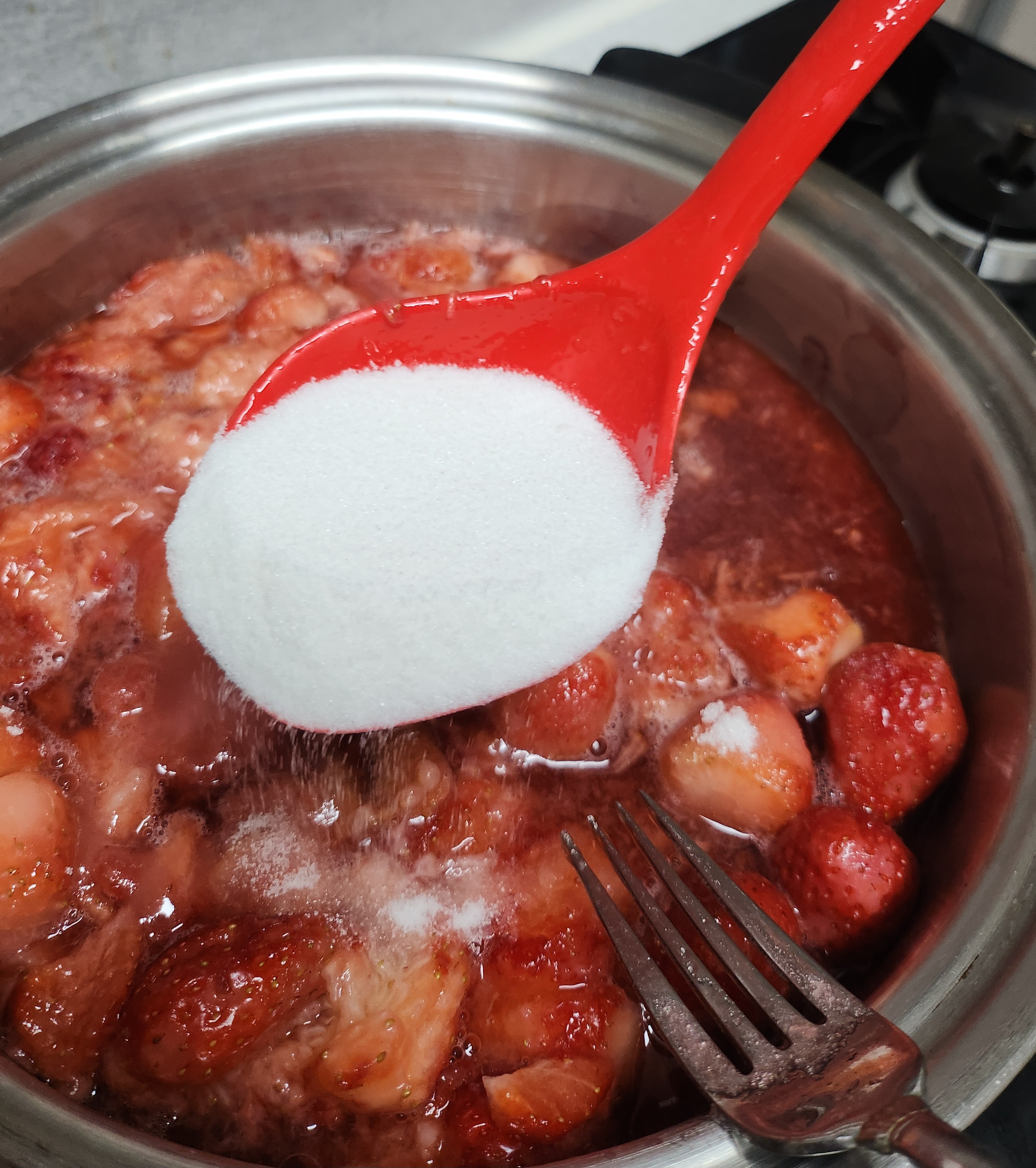설탕은 딸기와 동일비율이지만 많이 단 것이 싫으면 80퍼센트 정도만 넣고 끓인다.