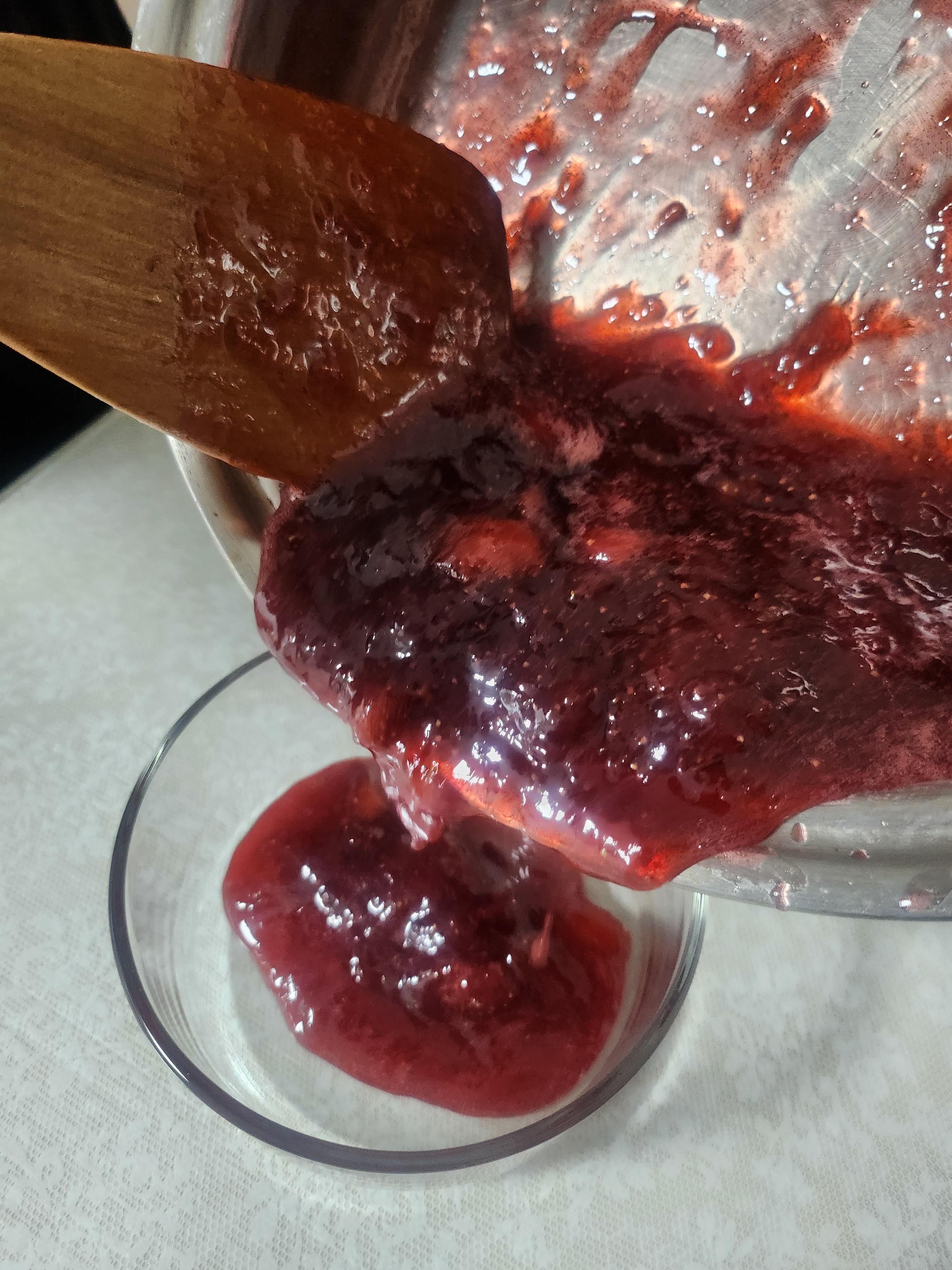 완성이 덜 된 잼은 물에 떨어뜨리면 물속에서 이렇게 풀어진다.