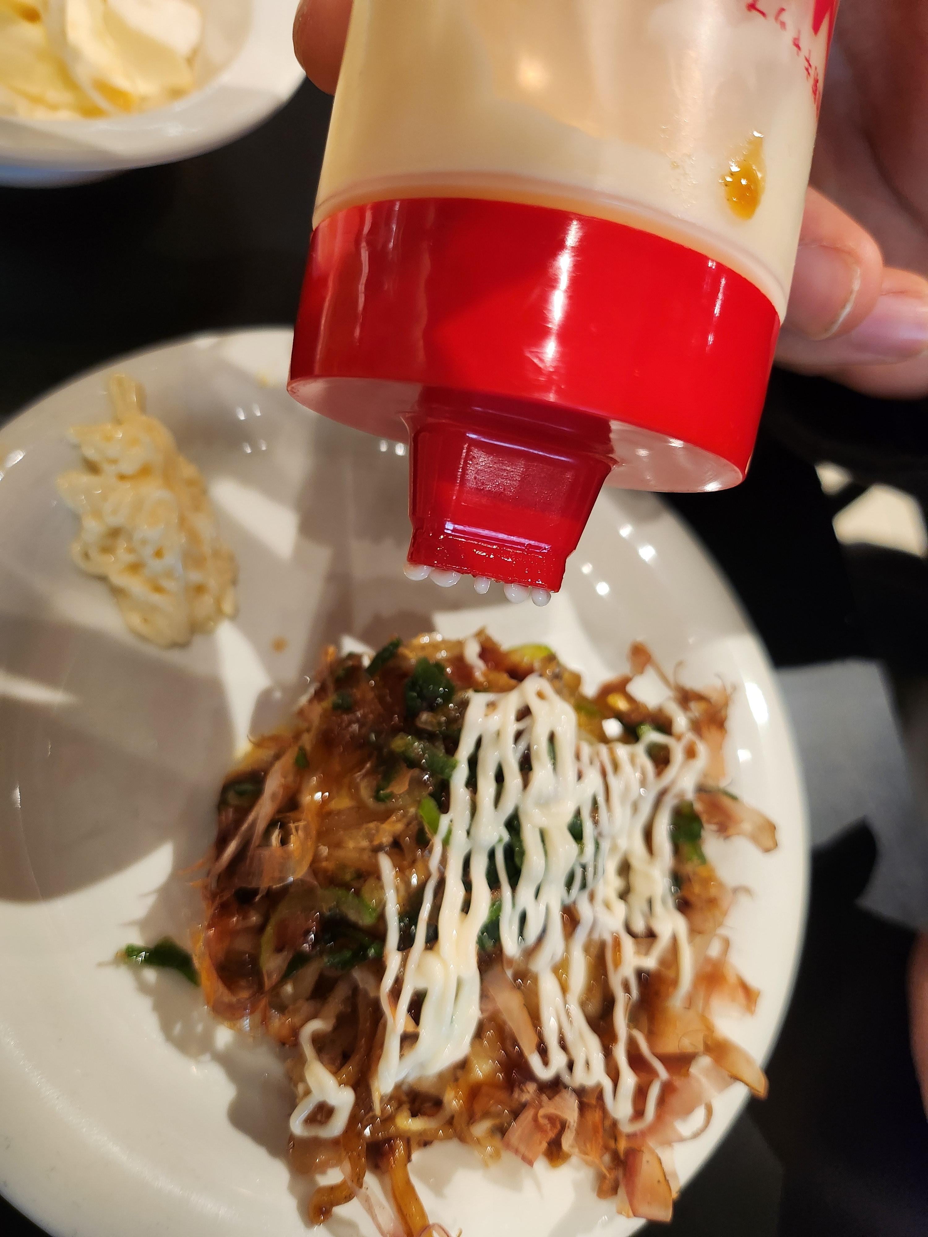 마요네즈 뿌려지는 것도 오꼬노미야끼스럽다.