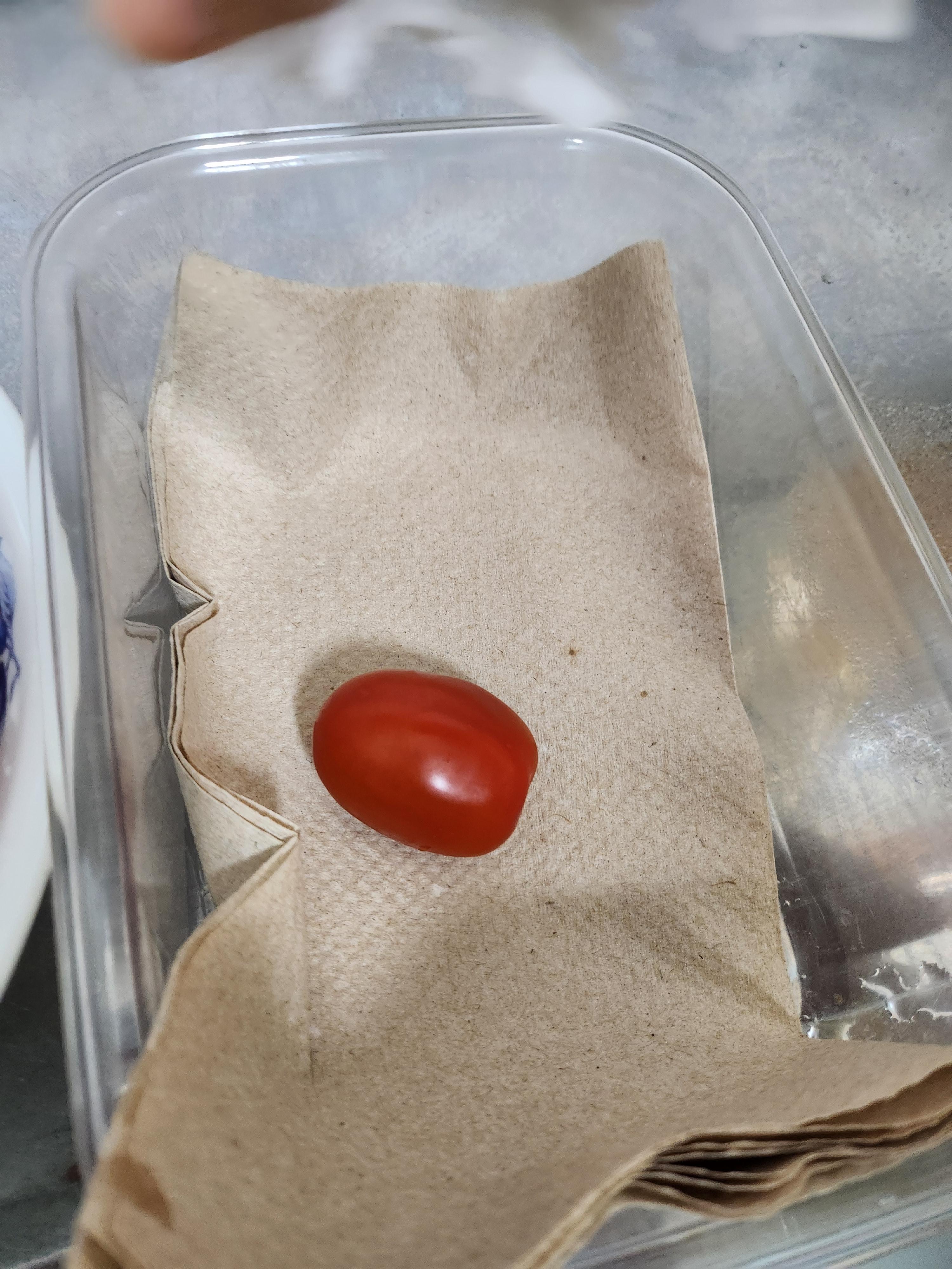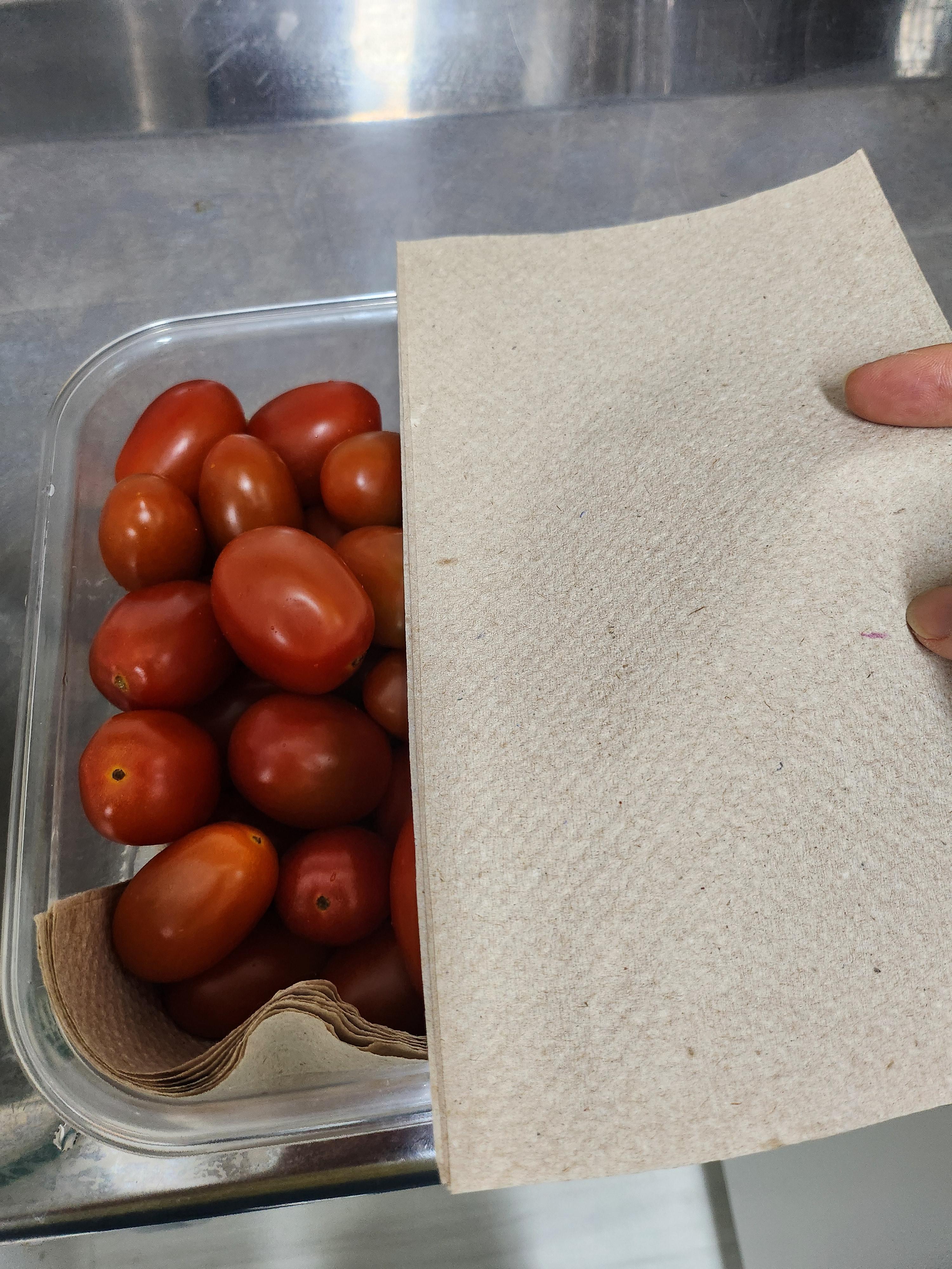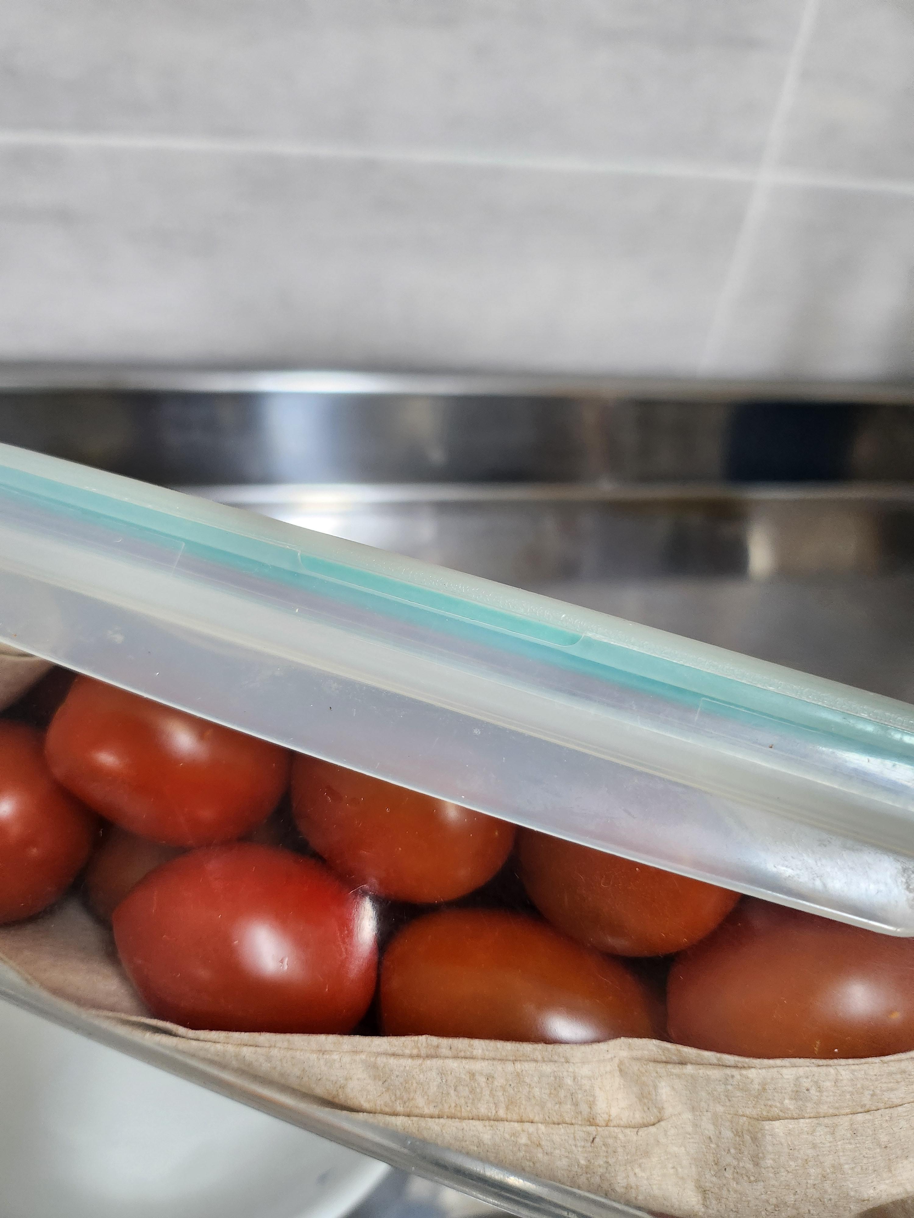 위쪽도 키친타월을 올려주고 뚜껑을 닫아 습기가 뚜껑에 맺히지 않게 해서 최대한 물기가 토마토에 묻지 않게 한다